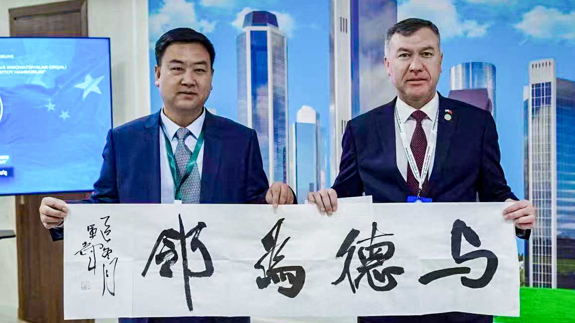 在统一组织的乌兹别克斯坦国立世界语言大学参观考察中,与该校汉语学专业学生围绕中国书法艺术进行了现场交流,对学生作品作了点评和鼓励,为伊尔霍姆琼•图克斯塔西诺夫校长现场题赠了“与德为邻”书法作品,以笔墨传递深情厚谊,展现了中国传统文化魅力。