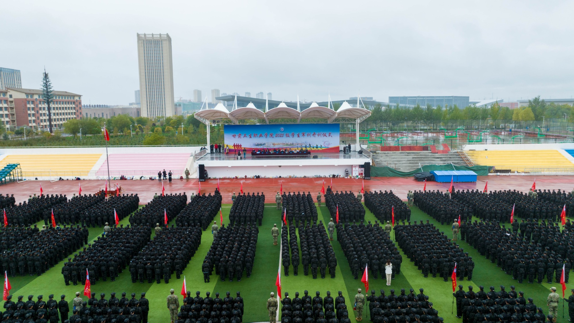 10月10日上午,学校在云飞体育场举行2025级新生军训动员大会暨开训仪式。全体在家校领导出席,相关部门负责人、二级学院党总支书记、兰州警备区承训教官、新生辅导员、2025级全体新生参加。