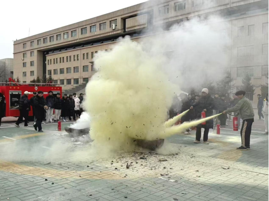 其次,在体育馆北侧场地进行应急逃生演练,模拟火灾情景,包括火情报警、初期火灾扑救、人员疏散等环节。演练过程中,同学们按照预案迅速响应,有序疏散、安全撤离。随后教官详细讲解并示范消防器材的正确使用技巧,同学们积极参与并体验火灾应急处理过程,进一步提升了消防应急处置能力。