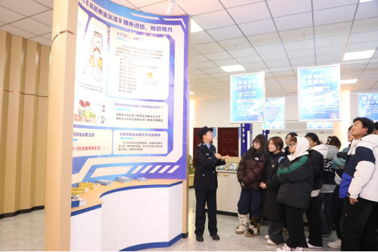 警务室民警带领师生代表参观了警务室宣传中心,在防范网络电信诈骗板块,民警结合近年来校园高发的网络刷单、冒充客服退款等典型案例,详细拆解诈骗分子作案套路,重点提醒学生“凡是要求转账汇款的都是诈骗”“不轻易泄露个人信息”。反恐宣传板块前,民警讲解了校园反恐防爆基本常识及突发恐怖事件的应急避险技巧。在禁毒宣传区,民警通过介绍仿真毒品模型、案例图文等形式,普及常见毒品及涉麻精药品的危害,讲解成瘾性物质的识别方法。反邪宣传教育则通过播放典型案例视频,揭露邪教迷惑群众、危害家庭与社会的本质,引导师生树立正确的世界观、价值观。