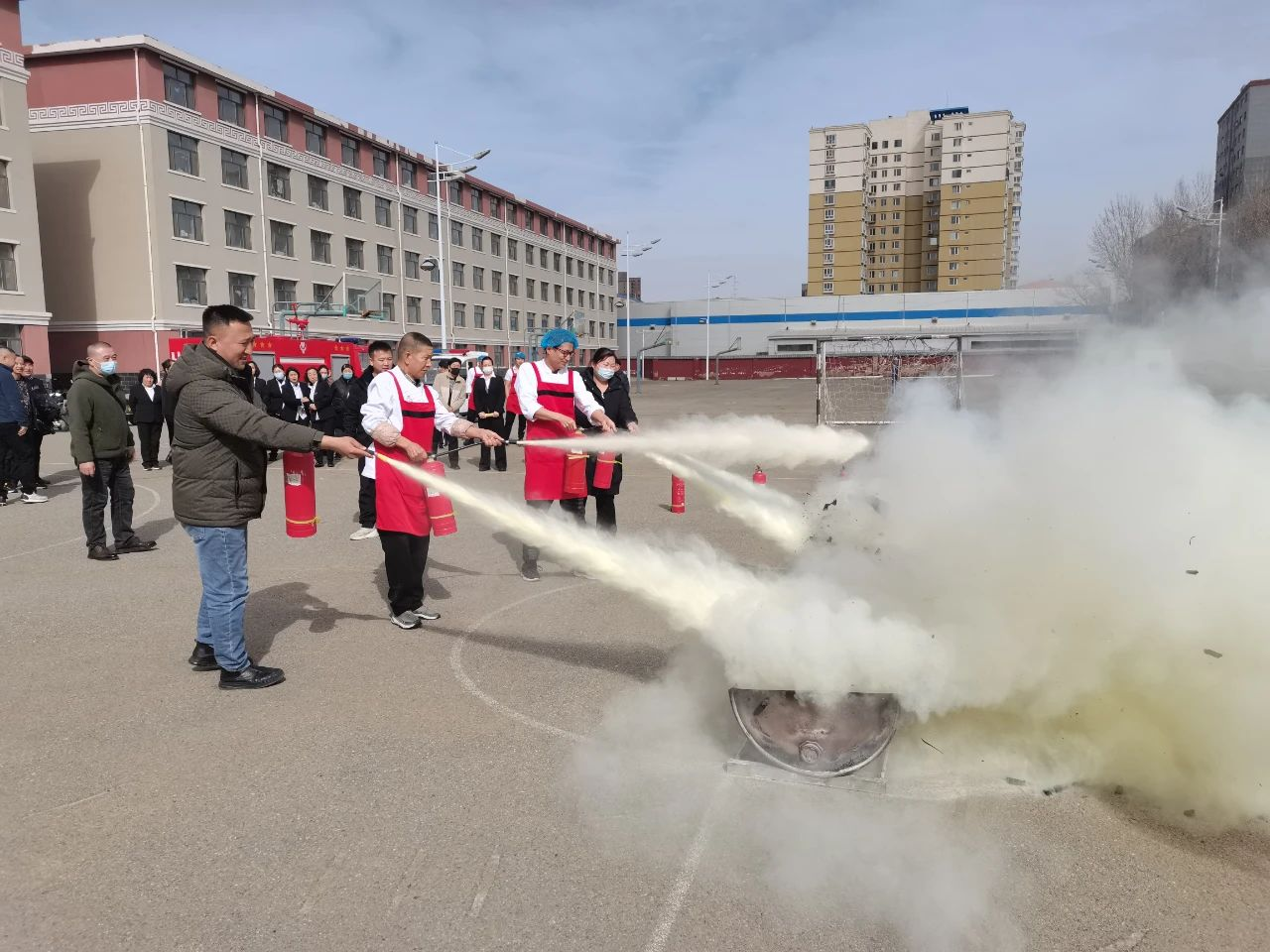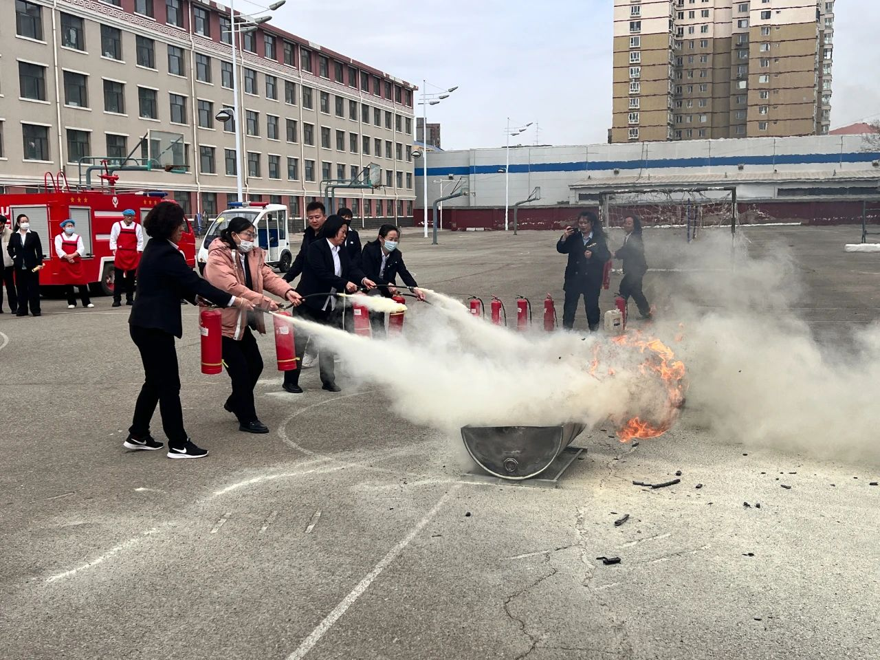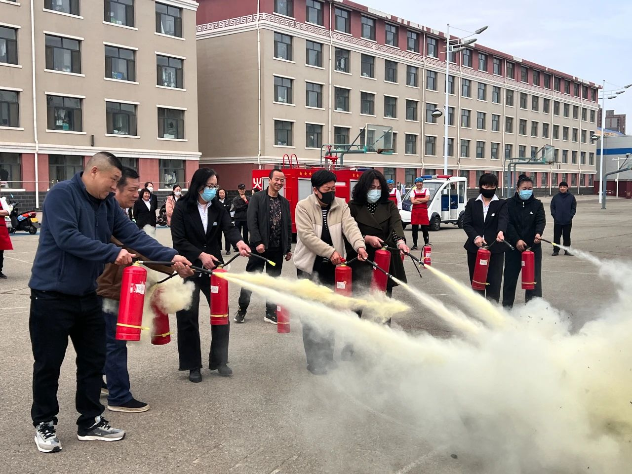随后,在10号公寓南侧空地开展灭火应急演练。技术人员现场演示了各类消防器材的正确使用方法,包括灭火器、灭火毯等。培训人员积极参与体验操作消防器材,进一步掌握如何在紧急情况下迅速有效扑灭初期火灾。