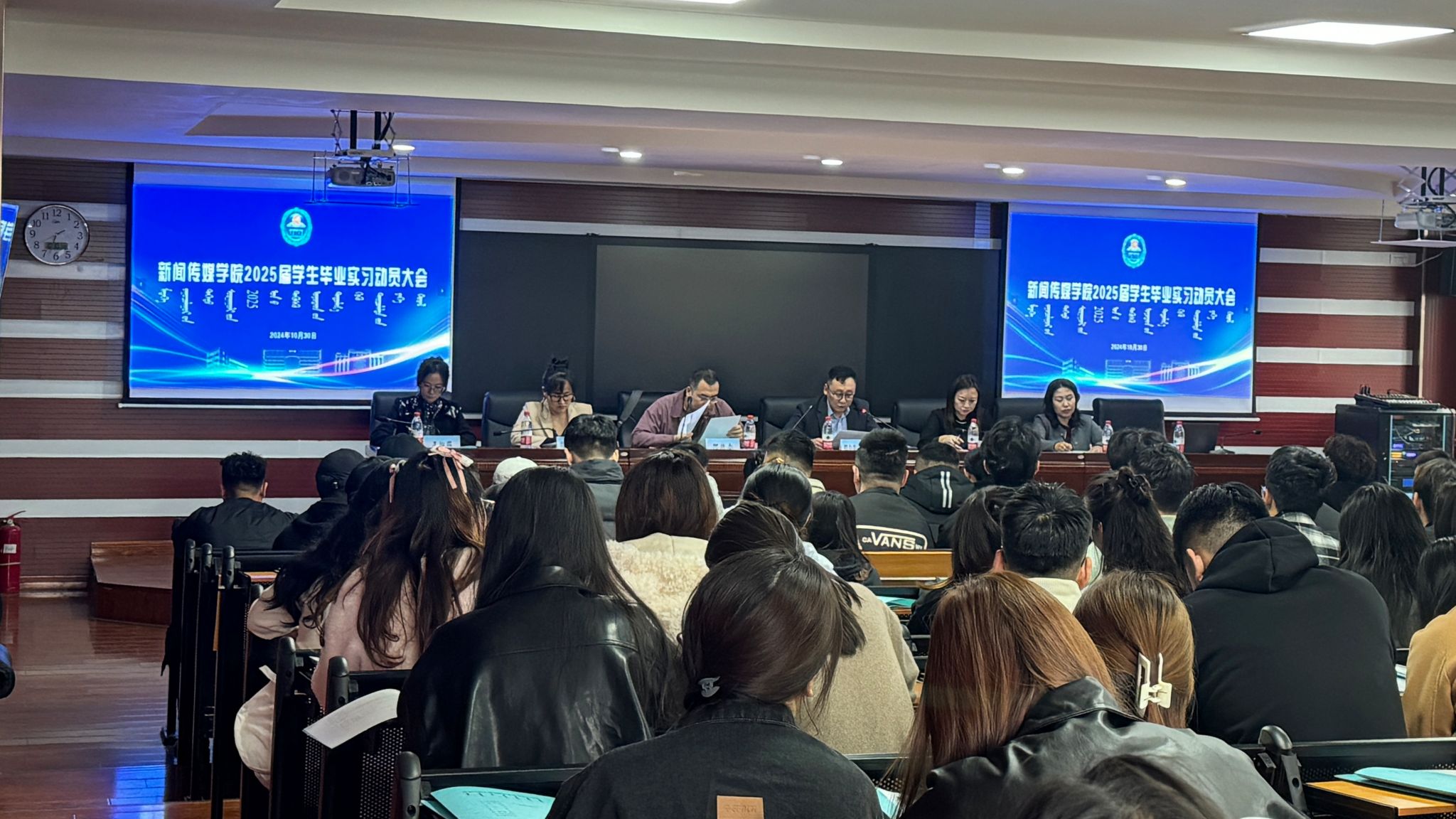 为了确保2025届学生毕业实习工作顺利进行,10月30日下午,新闻传媒学院于尚智楼413报告厅举办2025届学生毕业实习动员大会。新闻传媒学院院长额尔敦毕力格、党总支副书记王丽、团总支书记图木舍、教学科研办公室主任阿特尔出席,2021级全体学生参加,大会由阿特尔主持。
