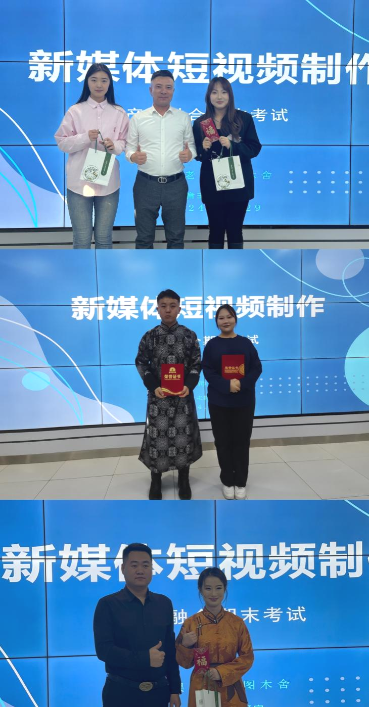 为深化校企合作、推进产教融合,提升教育质量与人才培养水平,11月29日上午,新闻传媒学院2022级播音与主持艺术班《新媒体短视频制作》产教融合期末考试在都林楼501教室举行,学校党委委员、组织部部长吴阿古拉,教务处处长肖查娜,新闻传媒学院党总支书记苏伦高娃,院长额尔敦毕力格,党总支副书记王丽,副院长安迎春现场观看。播音与主持艺术教研室主任乌日更照来与相关企业代表担任评委。