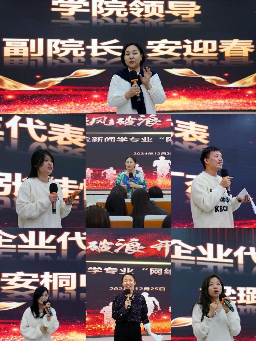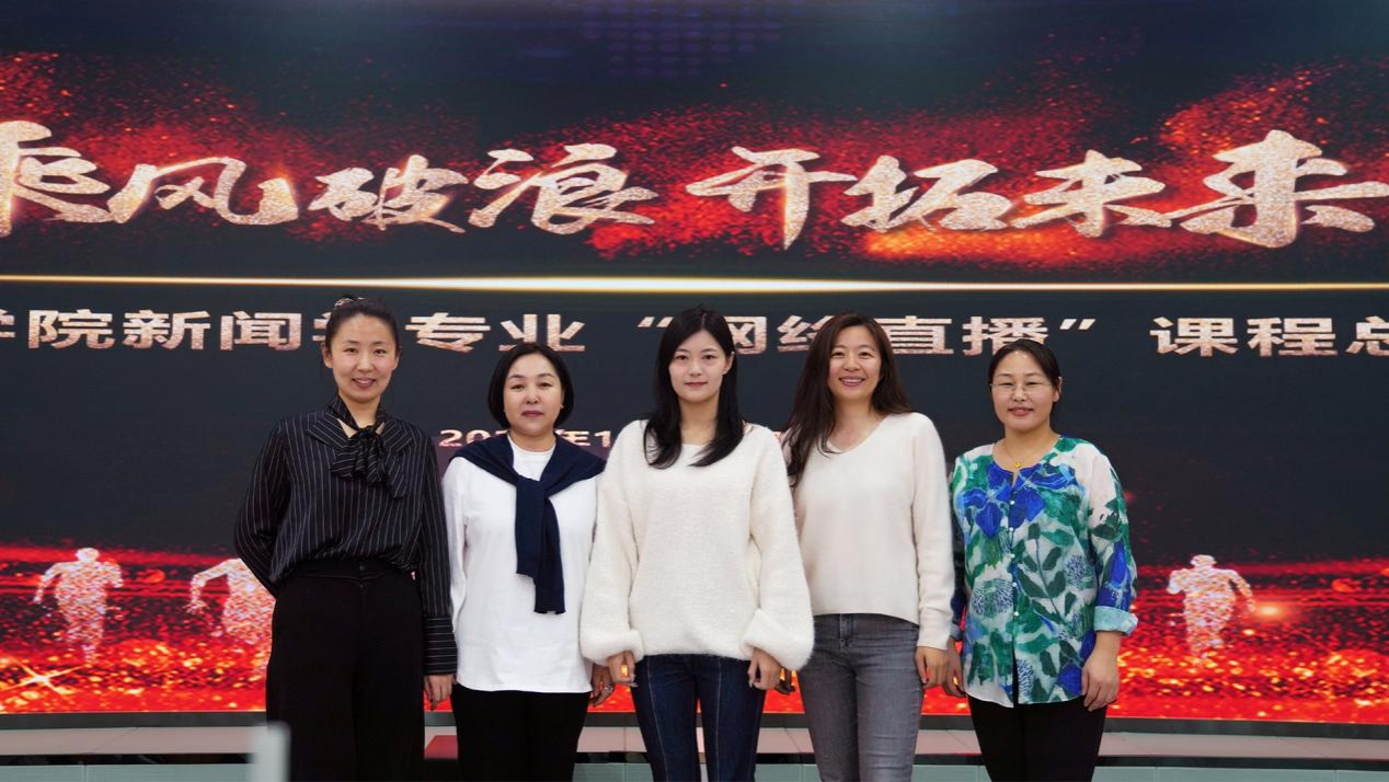 总结会议由珠丽老师详细介绍2022级新闻学班、2024级新闻学(专升本)班的课程安排和实践成果。两个班级通过16周的理论与实践相结合,实现了产教融合的教学模式,直播带货销量优异。企业导师安桐申、梁璐和学生代表丁杰、张佳怡分别分享了他们的感想和收获。副院长安迎春、教研室主任萨仁高娃在总结发言中肯定了该课程的成效,并对下一步深化产教融合提出了几点建议。