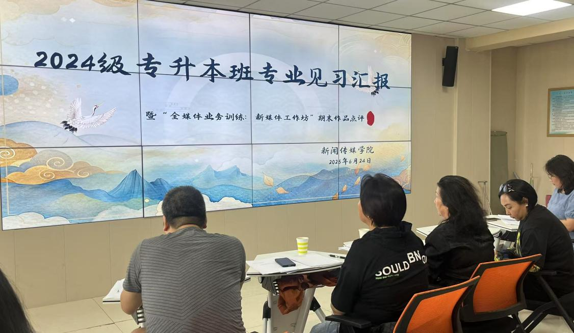 6月24日,新闻传媒学院2024级新闻学专升本班专业见习汇报暨“全媒体业务训练”课程期末成果展评活动在都林楼314教室举行。活动沿用教考分离模式,由原内蒙古广播电视台新闻中心摄像部主任包金花、学院教师王高娃、阿特尔担任评委,现场为33名学生的7部视频、50张海报进行打分点评。