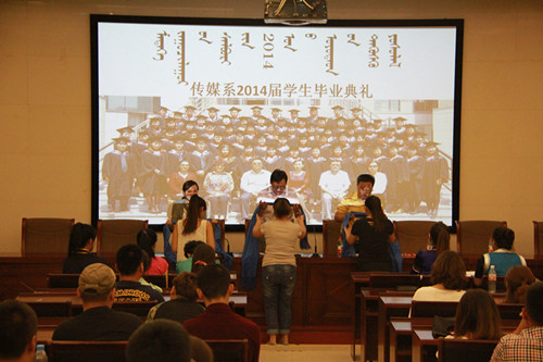 2014年5月30日下午7点,传媒系在图书馆一楼报告厅举办了2014届学生毕业典礼。毕业典礼上,优秀学生代表楚娜等同学作了实习和考研经验交流,毕业生代表阿日滨为母校深情致辞,吴旦旦代表全体毕业生为传媒系全体老师献上写有“师恩深似海,桃李满天下”的锦旗。
