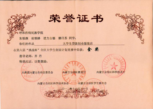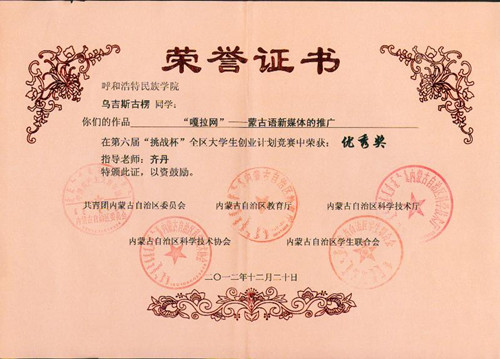 由自治区团委、教育厅、科技厅、科协、学联共同主办的第六届“挑战杯”全区大学生创业计划竞赛中,传媒系共有两件作品入围决赛,其中由齐丹老师指导的朱领燕、侯领娣、道力吉德、娜日苏等四名同学的作品《大学生贷款创业服装店》获得金奖;由齐丹老师指导的乌吉斯古楞同学的作品《“嘎拉网”——蒙古语新媒体的推广》获得优秀奖。