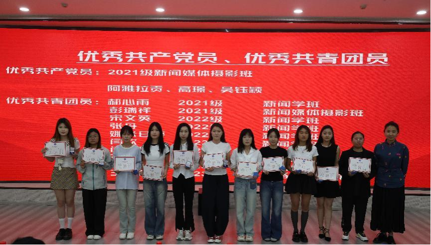 新闻传媒学院党政办公室主任珠丽为优秀共产党员、优秀共青团员颁奖