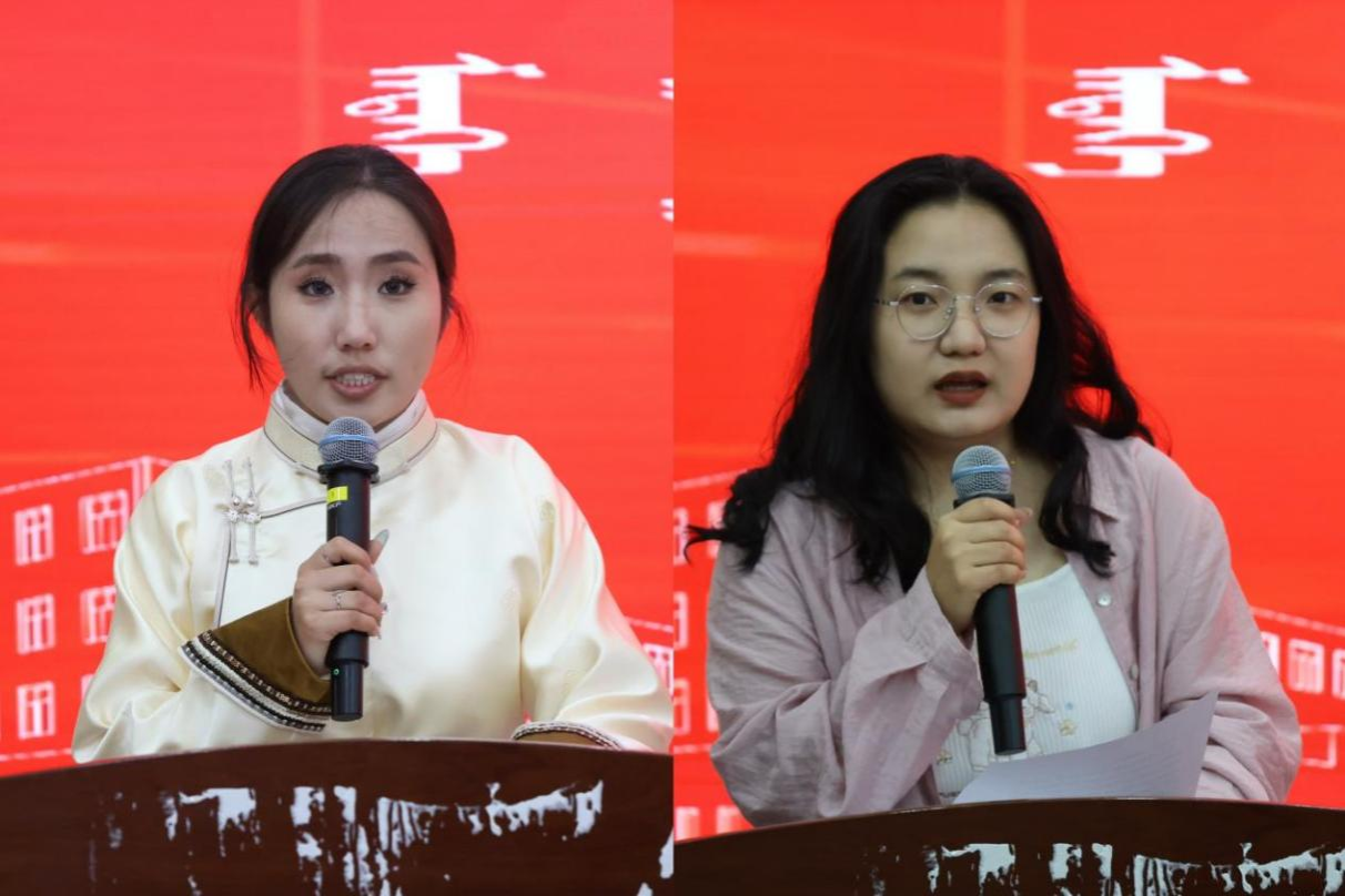 优秀毕业生代表2021级播音与主持艺术班娜仁高娃、2023级新闻学专升本班王爽发言