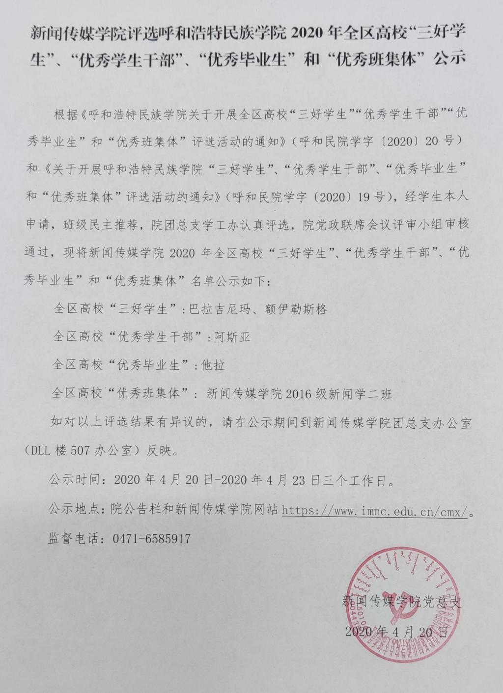 根据《YABO鸭脖关于开展全区高校“三好学生”“优秀学生干部”“优秀毕业生”和“优秀班集体”评选活动的通知》(呼和民院学字〔2020〕20号)和《关于开展YABO鸭脖“三好学生”、“优秀学生干部”、“优秀毕业生”和“优秀班集体”评选活动的通知》(呼和民院学字〔2020〕19号),经学生本人申请,班级民主推荐,院团总支学工办认真评选,院党政联席会议评审小组审核通过,现将新闻传媒学院2020年全区高校“三好学生”、“优秀学生干部”、“优秀毕业生”和“优秀班集体”名单公示如下: