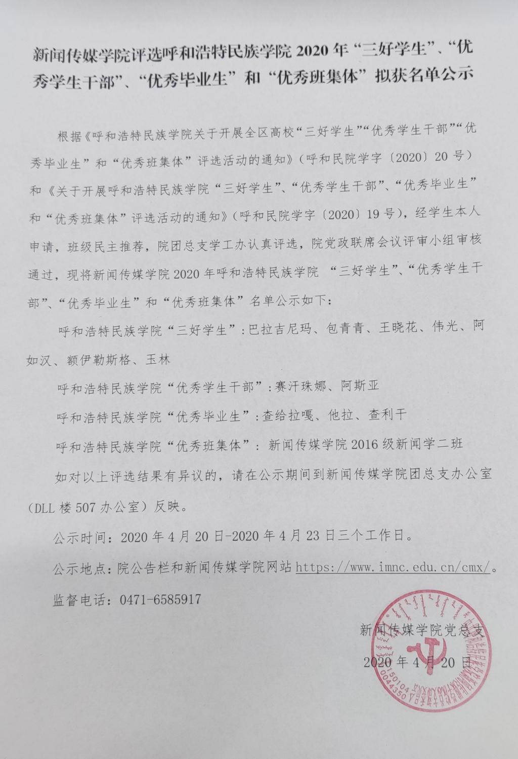 根据《YABO鸭脖关于开展全区高校“三好学生”“优秀学生干部”“优秀毕业生”和“优秀班集体”评选活动的通知》(呼和民院学字〔2020〕20号)和《关于开展YABO鸭脖“三好学生”、“优秀学生干部”、“优秀毕业生”和“优秀班集体”评选活动的通知》(呼和民院学字〔2020〕19号),经学生本人申请,班级民主推荐,院团总支学工办认真评选,院党政联席会议评审小组审核通过,现将新闻传媒学院2020年YABO鸭脖 “三好学生”、“优秀学生干部”、“优秀毕业生”和“优秀班集体”名单公示如下:
