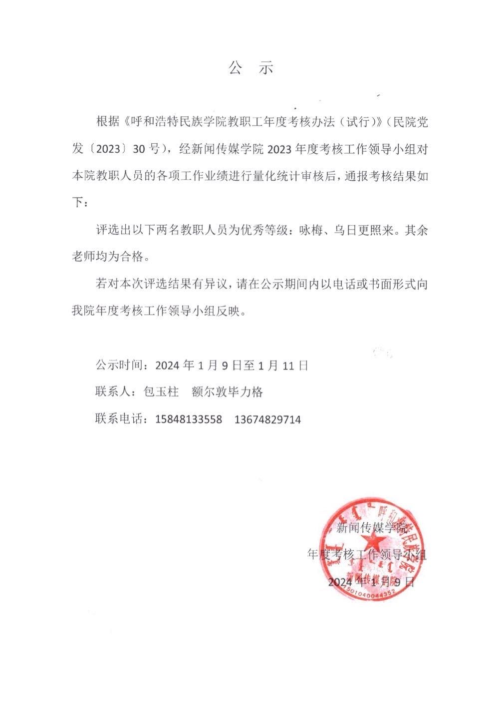 关于新闻传媒学院2023年度教职工考核结果的公示