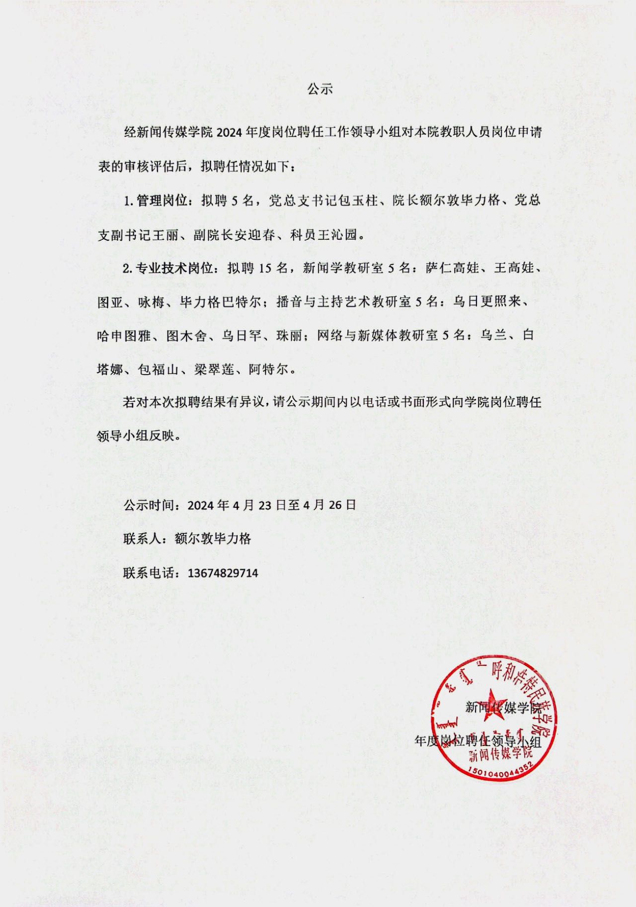 关于新闻传媒学院2024年度岗位聘任工作拟聘结果的公示