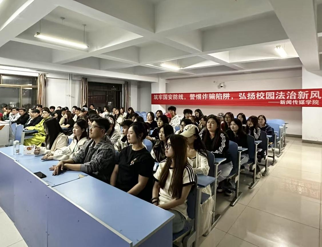 为迎接第十个全民国家安全教育日,增强学生国家安全意识与反诈能力,4月14日,新闻传媒学院在都林楼502教室举办“筑牢国安防线,警惕诈骗陷阱,弘扬校园法治新风”主题教育活动。学校法学院教师娜人花博士受邀担任主讲嘉宾,学院近百名学生参加活动。