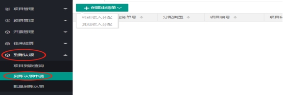 1.登录系统之后,点击左侧的到账认领/到账认领申请/创建申请单。