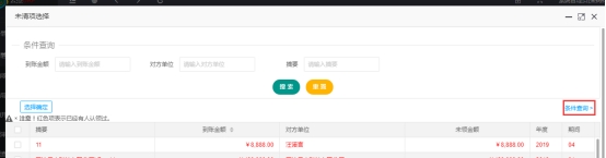 首先选择哪笔款项为该认领款项,点击白框内的加符号,弹出选项框,选择对应款项即可。可以通过条件查询的方式进行筛选。红色款项为认领过款项,不可再次选择。