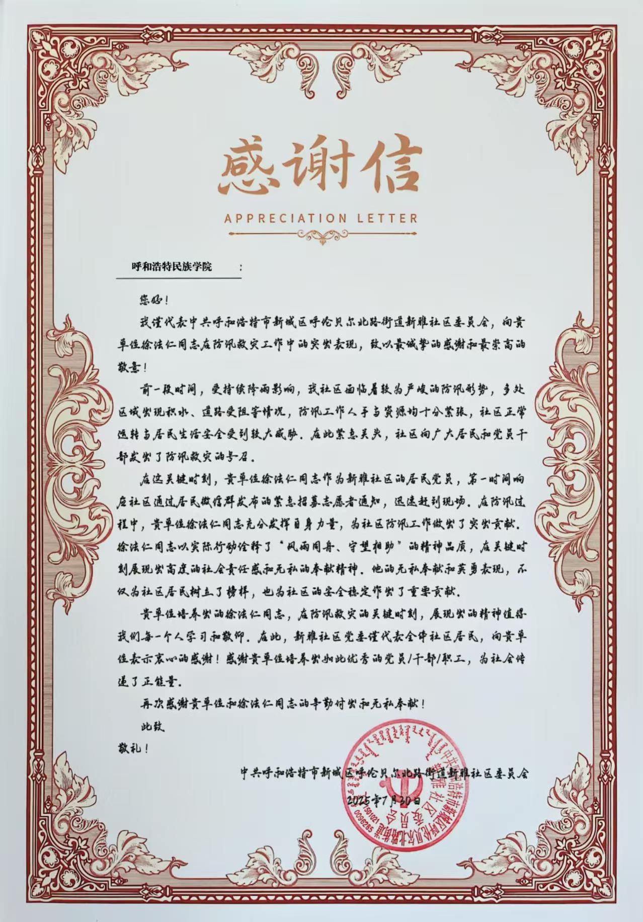 近日,学校收到新雅社区委员会发来的感谢信,对鸭脖财务处党支部徐法仁同志在社区抗洪救灾中做出的贡献表示了衷心的感谢和崇高的敬意!
