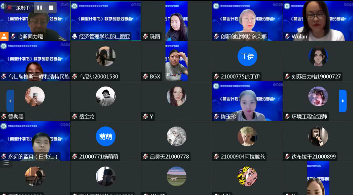为优化创新创业思维与训练课程教学设计,提升教师授课水平,11月26日晚上,创新创业学院组织举办了《商业计划书》教学创新分享线上交流会,创新创业教研室教师和50余名学生参加,经济管理学院那仁图亚副教授对《创新创业思维与训练》课程中商业计划书写作部分作了分享,活动由新闻传媒学院珠丽博士主持。