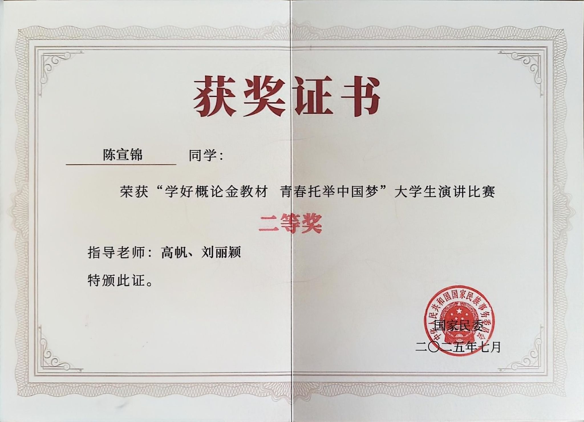 为深入贯彻落实习近平总书记关于加强和改进民族工作的重要思想及编好用好《中华民族共同体概论》教材、把铸牢中华民族共同体意识作为学校思政课的一个重点等重要指示精神,激发学生学习的积极性主动性创造性,提升概论课程教育教学实效,引导青年学生树牢正确的中华民族历史观,7月15日,由国家民委主办,教育部、共青团中央协办的“学好概论金教材,青春托举中国梦”大学生演讲比赛决赛在中央民族大学举行。国家民委教育司司长宋全,教育部民族教育司副司长朱瑞,共青团中央统战部副部长李昊,中央民族大学党委副书记、副校长杨慕云出席开幕式并致辞,国家民委教育司一级巡视员李学锋主持开幕式。由鸭脖党委统战部推送,文学院、马克思主义学院联合指导的“北疆小红马”大学生讲解团成员、新闻传媒学院2023级学生陈宣锦以优异成绩获得本科院校组二等奖。