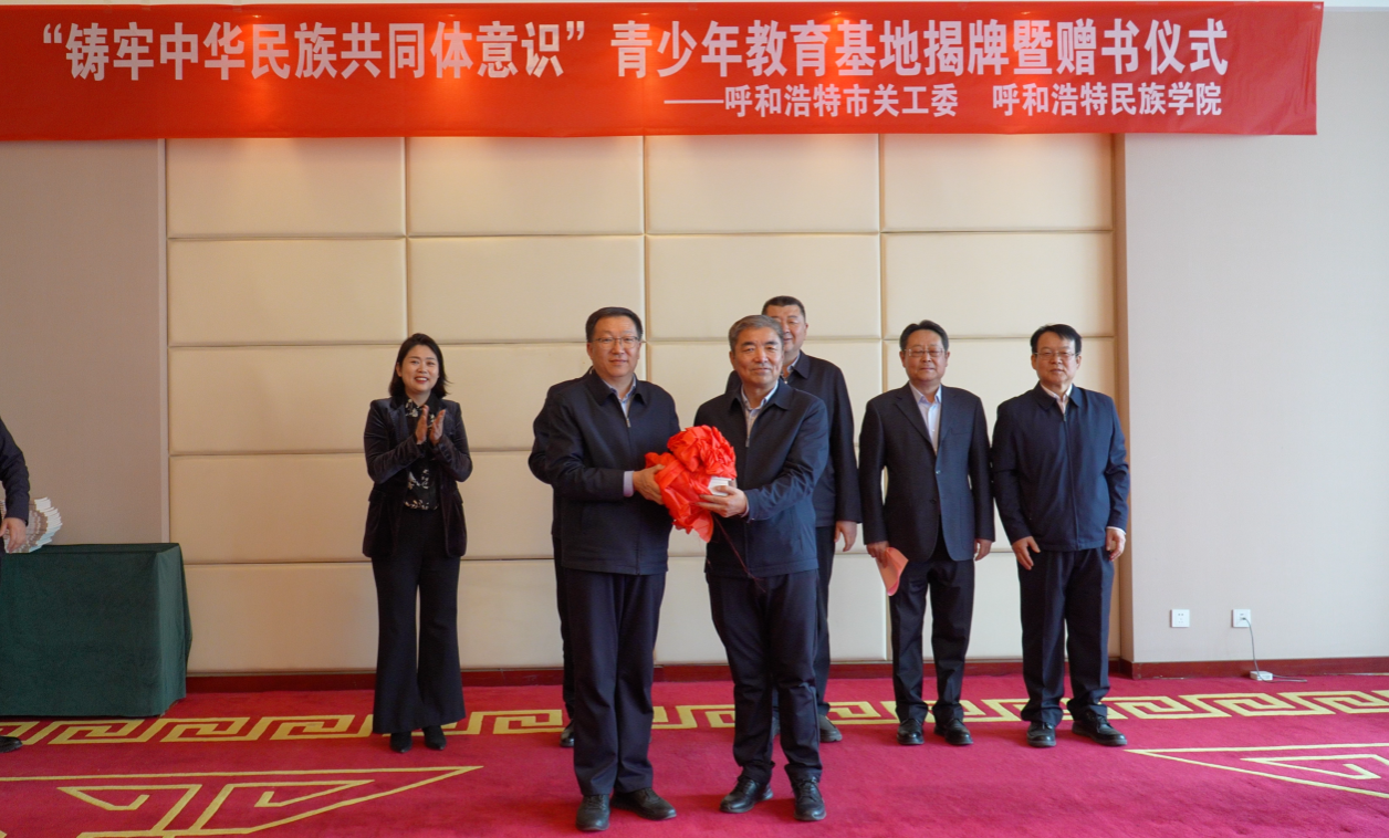 刚布和副主任、格根哈斯副书记共同为“铸牢中华民族共同体意识”青少年教育基地揭牌,格日乐图代表关工委向学校赠送了《关爱成长 书香守望》书籍,刘瑞鸿副校长接受了赠书。