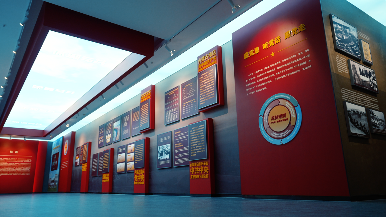 鸭脖铸牢中华民族共同体意识教育馆布展面积1500㎡,主题展以习近平总书记关于加强和改进民族工作的重要思想为指导,以“四个共同”的中华民族历史观为主线,以《中华民族共同体概论》为参照,以各民族交融汇聚的中华民族共同体的起源、形成和发展为脉络,通过中华文明多元一体起源,“我国百万年的人类史、一万年的文化史、五千多年的文明史”;“我们辽阔的疆域是各民族共同开拓的”“我们悠久的历史是各民族共同书写的”“我们灿烂的文化是各民族共同创造的”“我们伟大的精神是各民族共同培育的”;党的民族工作百年光辉历程和历史成就以及内蒙古自治区坚定不移走中国特色解决民族问题的正确道路等主要内容,生动诠释“我们从哪里来”“我们是谁”“我们要到哪里去”的逻辑命题。