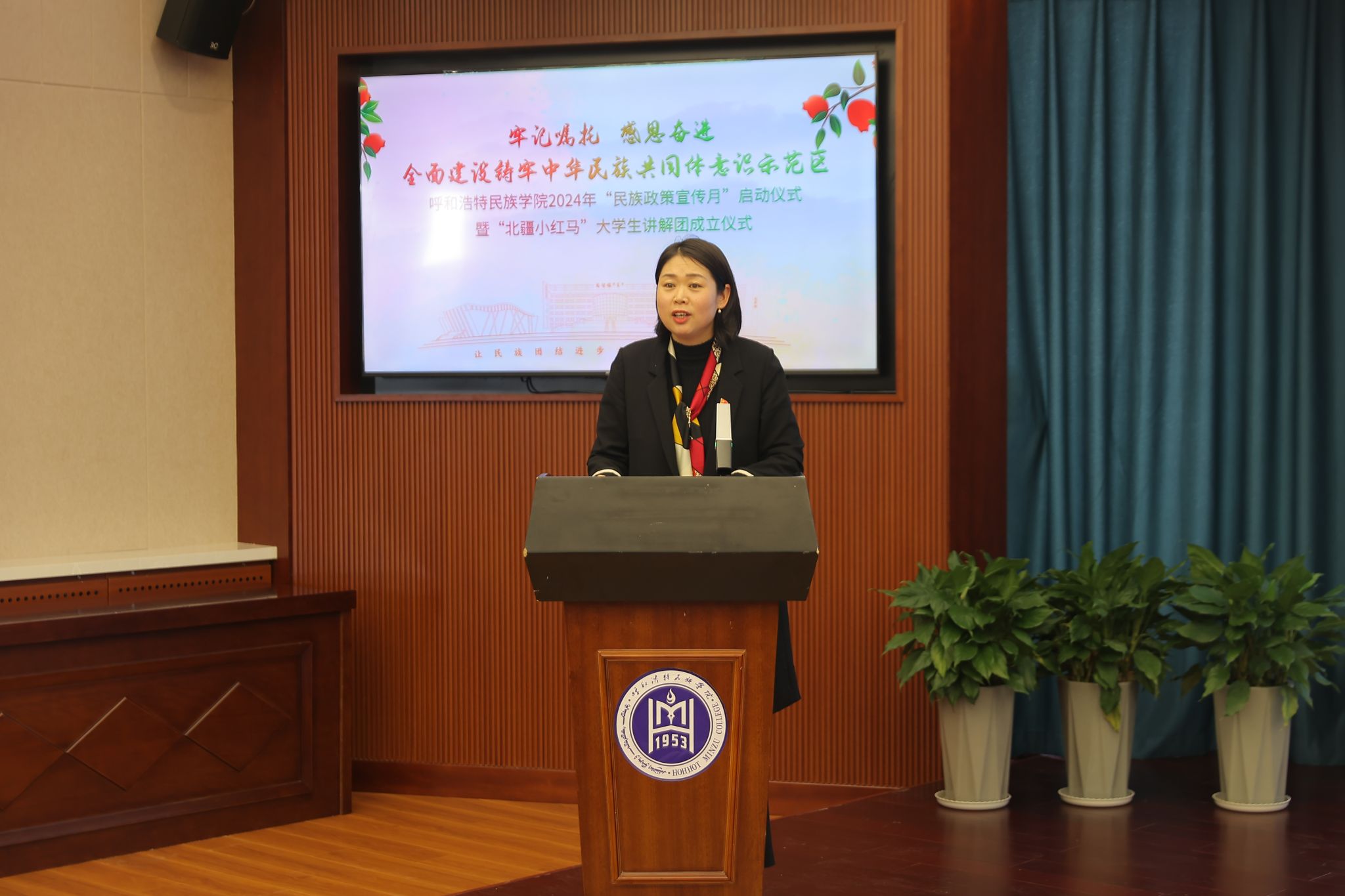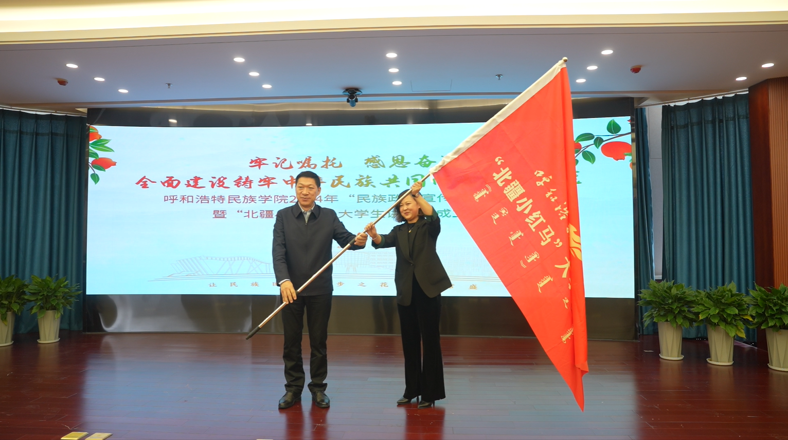 仪式上,党委书记刘九万向“北疆小红马”大学生讲解团指导教师刘丽颖授旗,额尔敦布和副校长向优秀讲解员颁发证书,包君部长解读了《民族政策宣传月活动方案》。