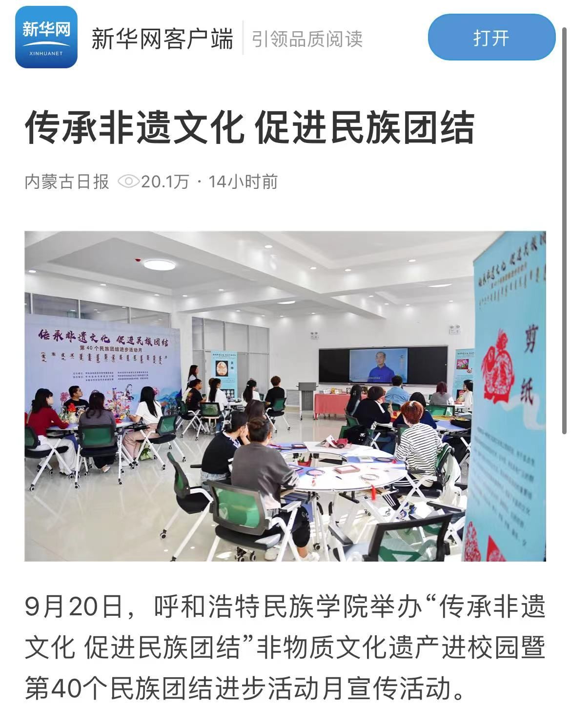 在第40个民族团结进步活动月,学校开展了系列活动,其中9月20日举办的“传承非遗文化 促进民族团结”非遗文化进校园活动,因内容丰富、形式新颖、特色鲜明,经学校积极与媒体联系,持续受到社会各界的广泛关注和大力宣传。其中,新华网客户端的报道刊发3小时,即达到15万人次的点击量。