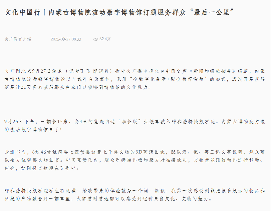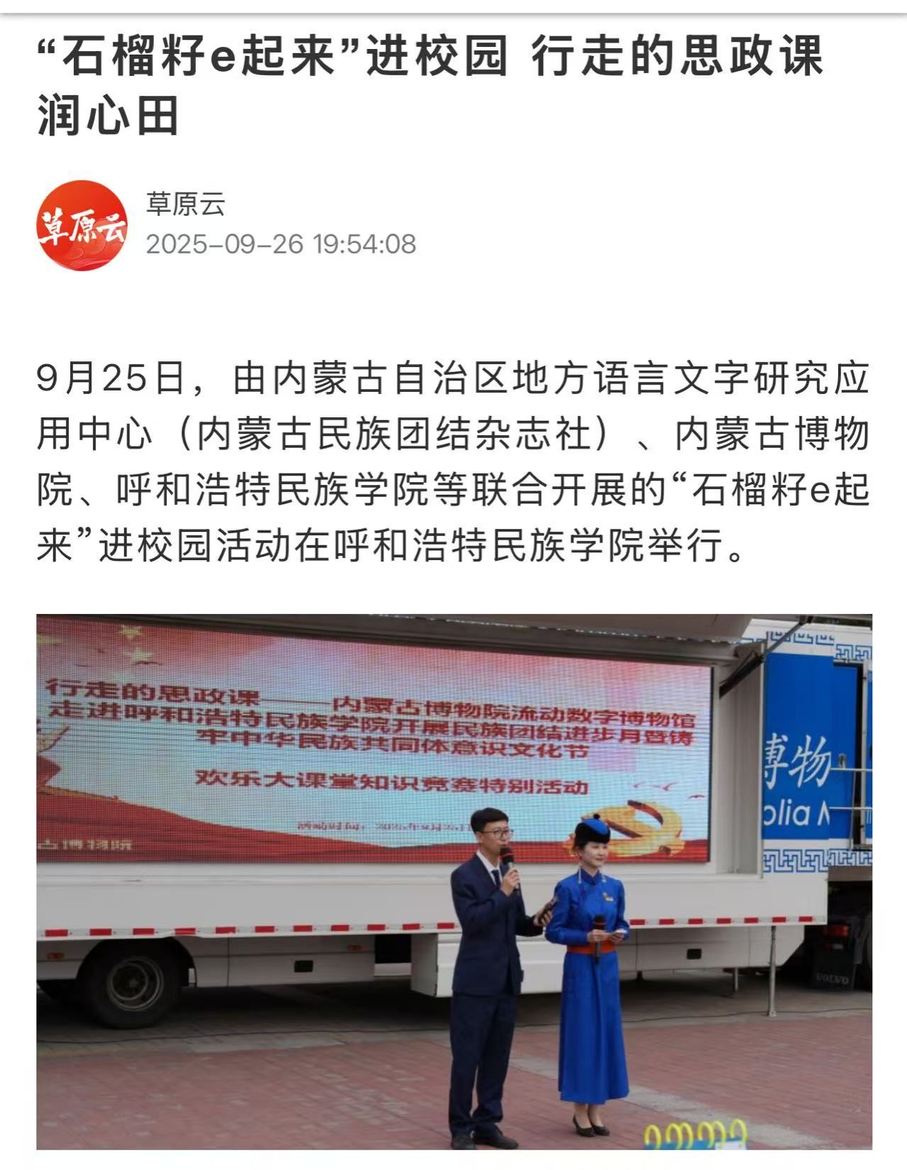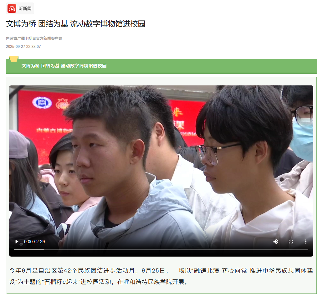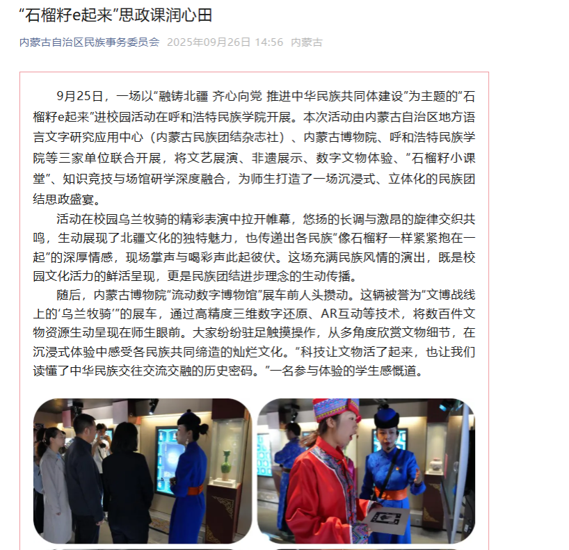 日前,央广网客户端、新闻纵横栏目、新闻报纸与摘要栏目、内蒙古广播电视台官方新闻客户端、草原云客户端、内蒙古统一战线公众号、内蒙古自治区民族事务委员会公众号、库伦融媒等官方媒体对鸭脖举办”石榴籽e起来 行走的思政课“——内蒙古博物院流动数字博物馆进校园暨学校铸牢中华民族共同体意识文化节活动和深入库伦旗开展民族团结进步助力乡村振兴等活动进行了宣传报道。