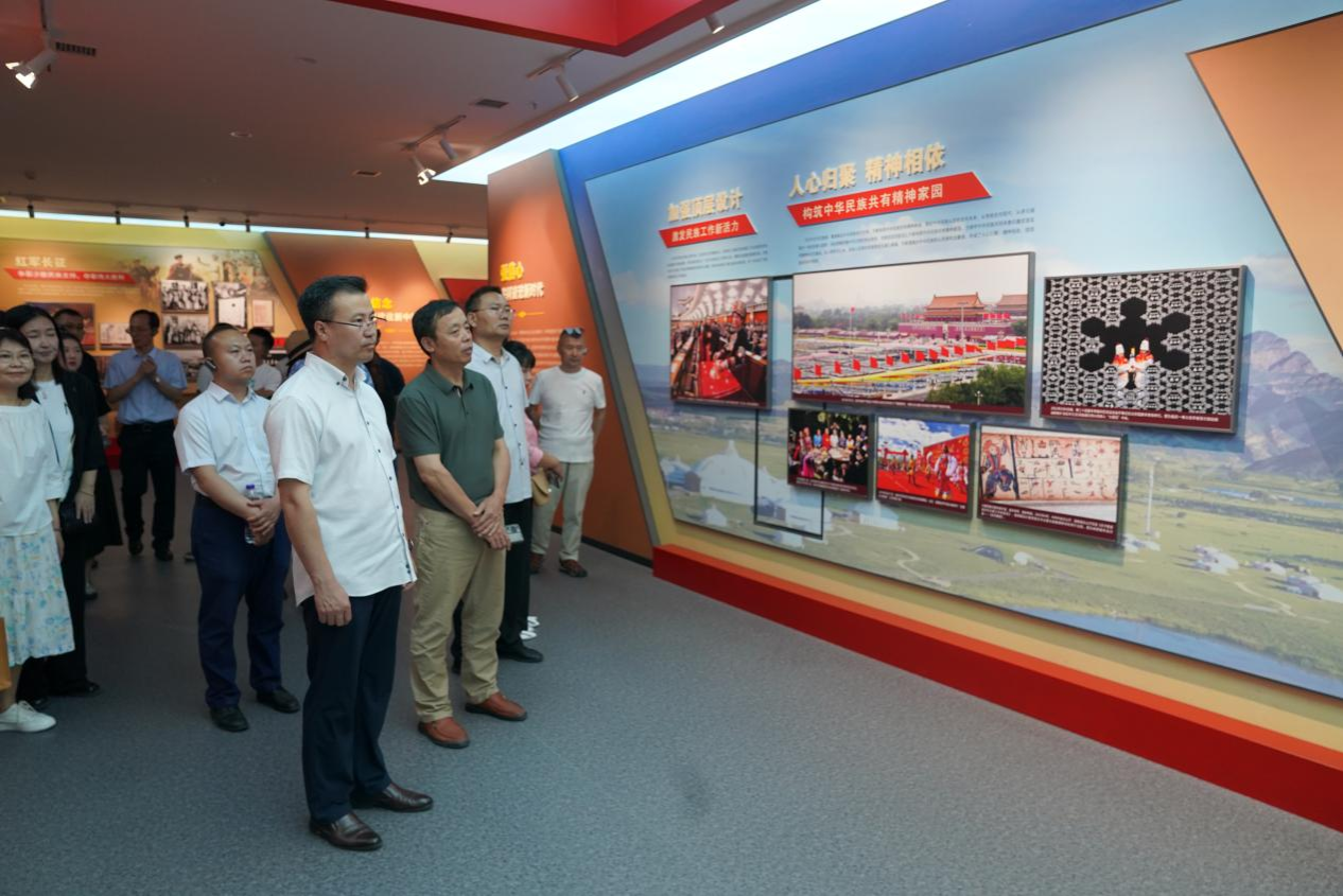 留联会一行首先参观了学校铸牢中华民族共同体意识教育馆。展览内容以习近平总书记提出的“铸牢中华民族共同体意识,就是要引导各族人民牢固树立休戚与共、荣辱与共、生死与共、命运与共的共同体理念”重要思想为指引,以铸牢中华民族共同体意识为主线,以《中华民族共同体概论课》为参照,以各民族交融汇聚的中华民族共同体的起源、形成和发展为脉线,以沉浸式的中华民族共同体时空隧道、艺术浮雕、数字投影、答题测试、历史照片和珍贵展品等多种形式,综合展示多元一体的中华民族形象和命运共同体的伟大历程,具有较高学术性、专业性、权威性和综合性。