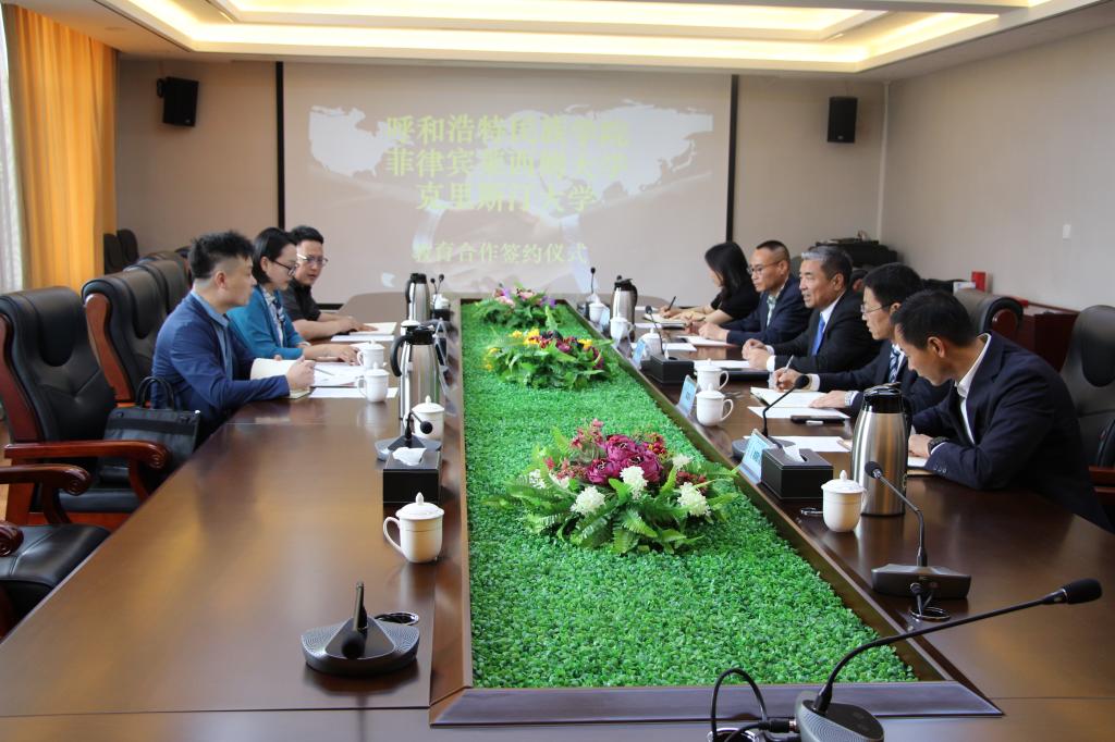 会谈中,格日乐图校长向菲方代表团一行介绍了鸭脖在人才培养、科研实力、学校发展规划及国际交流等方面的情况。菲方代表依次介绍了莱西姆大学、克里斯汀大学的基本情况、招生办法和办学模式等。会上,双方就联合培养、师资培训、师生互访及举办国际学术会议等事宜进行了深入探讨。