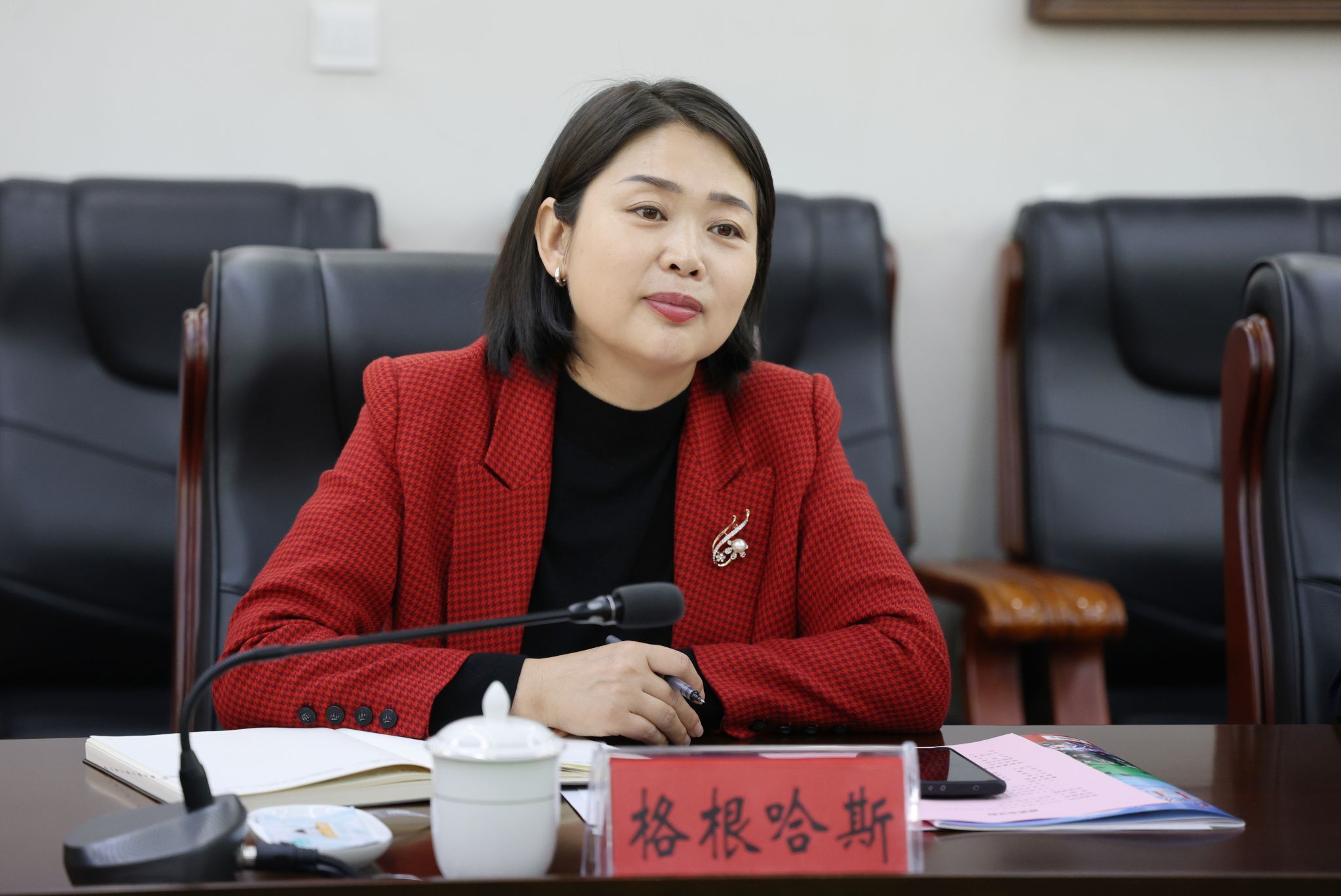 校党委副书记格根哈斯主持座谈并致欢迎辞。她围绕学校把民族团结进步教育作为学校发展最鲜亮的底色,落实立德树人根本任务,结合党建工作、宣传思想文化工作、特色专业和科研基地建设等经验做法作了交流。