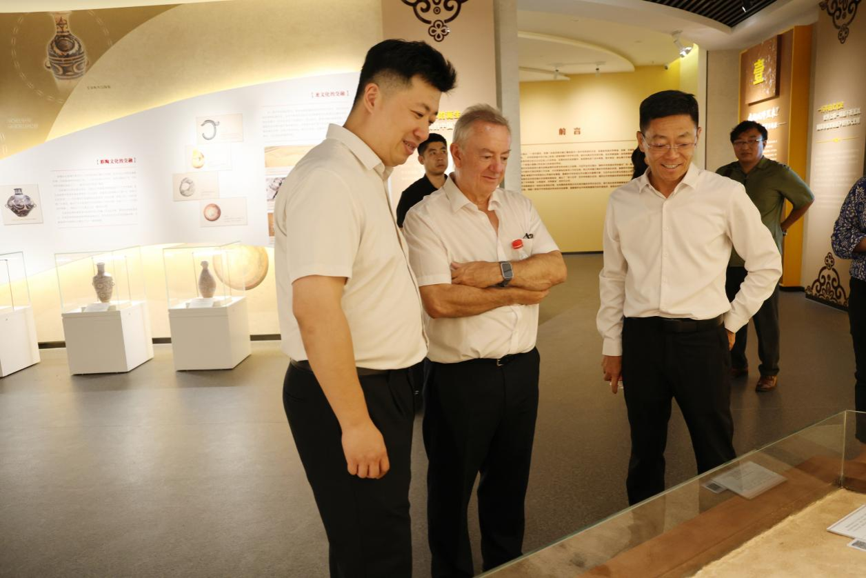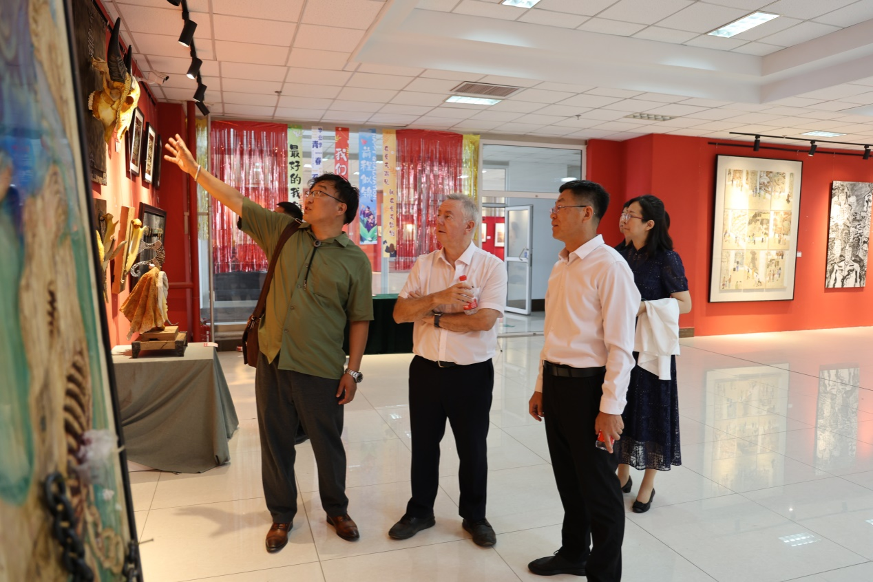 鲍勃·克莱恩一行在校领导的陪同下,参观了校史馆、铸牢中华民族共同体意识教育馆和美术学院2024届毕业生毕业作品展等。