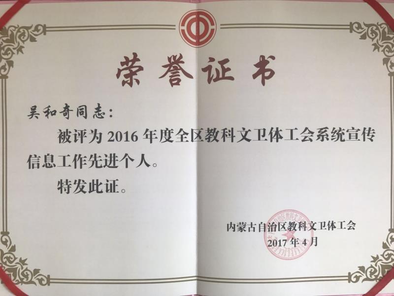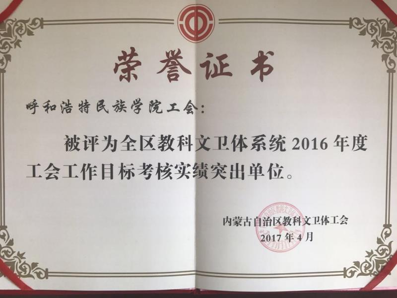在自治区教科文卫体工会年度考核中,鸭脖工会被评为 “2016年度目标考核实绩突出单位”,工会副主席吴和奇同志和闫晋亮同志获自治区教科文卫体工会“2016年度宣传信息工作先进个人”荣誉称号。
