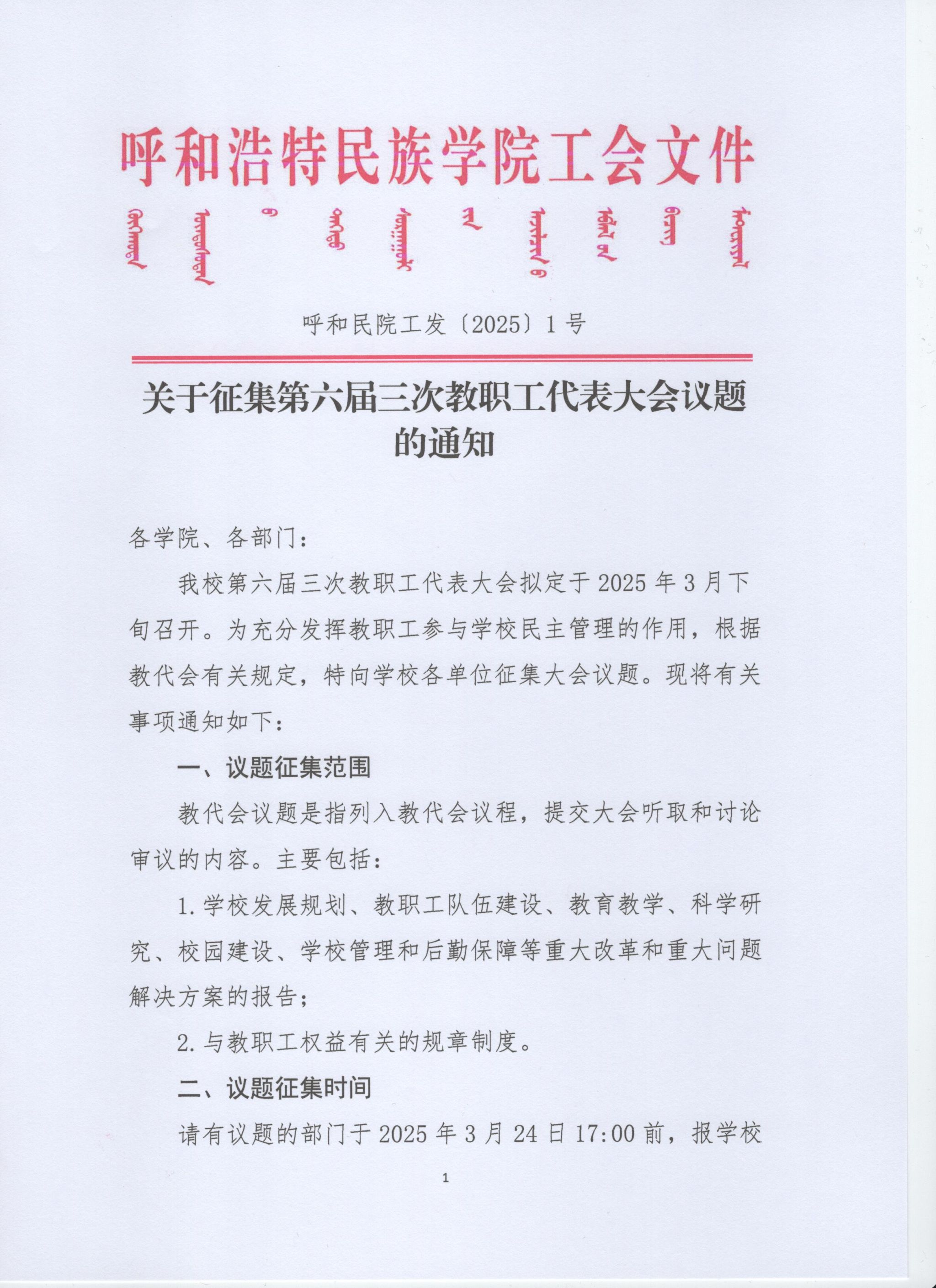 关于征集第六届三次教职工代表大会议题的通知