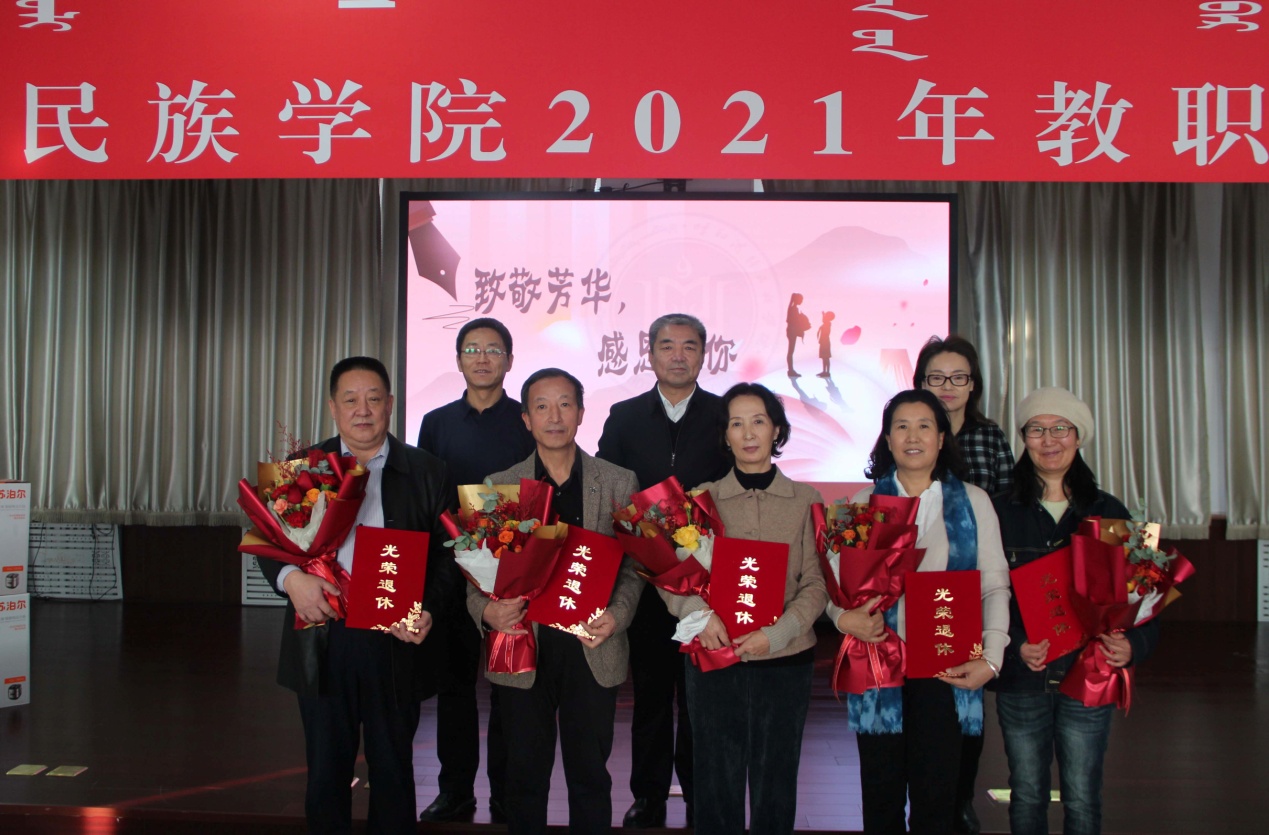 格日乐图校长代表学校党委向荣休教职工表示感谢,感谢他们把最美好的时光奉献了民院,将青春和智慧留在了校园,把立德树人、铸魂育人的使命担当写在了民院68年的发展史上。