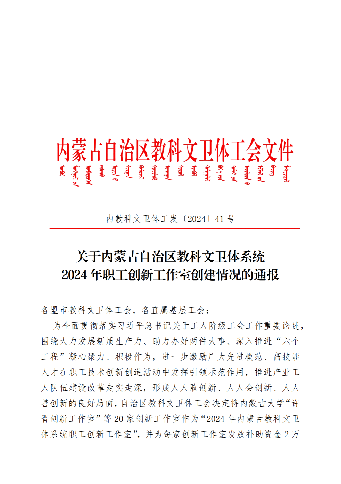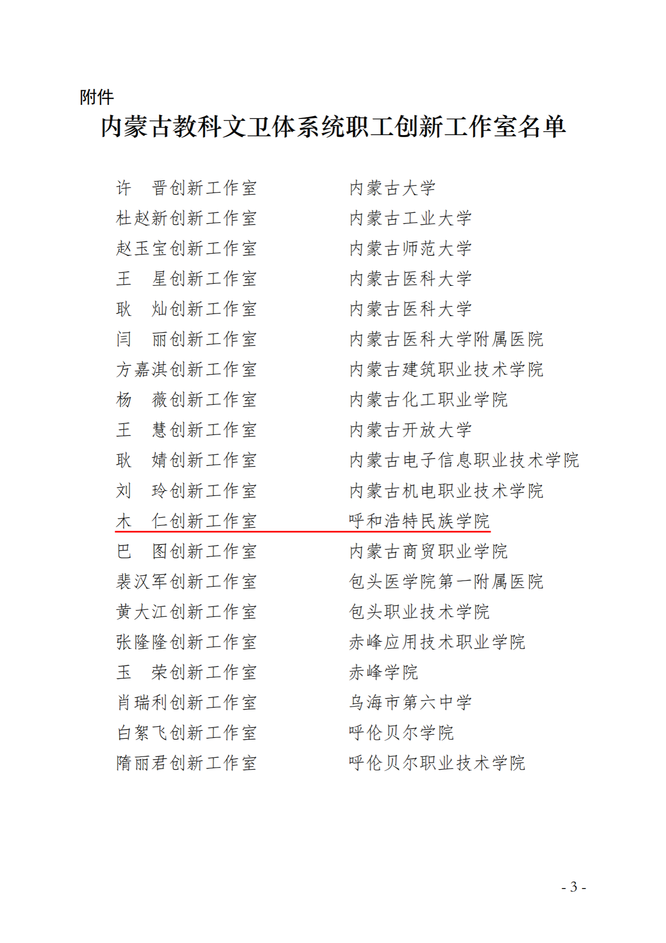 日前,内蒙古自治区教科文卫体工会印发《关于内蒙古自治区教科文卫体系统2024年职工创新工作室创建情况的通报》,鸭脖美术与设计学院申报的木仁创新工作室经学校组织申报、内蒙古自治区教科文卫体工会评审,成功获评为内蒙古教科文卫体系统职工创新工作室。
