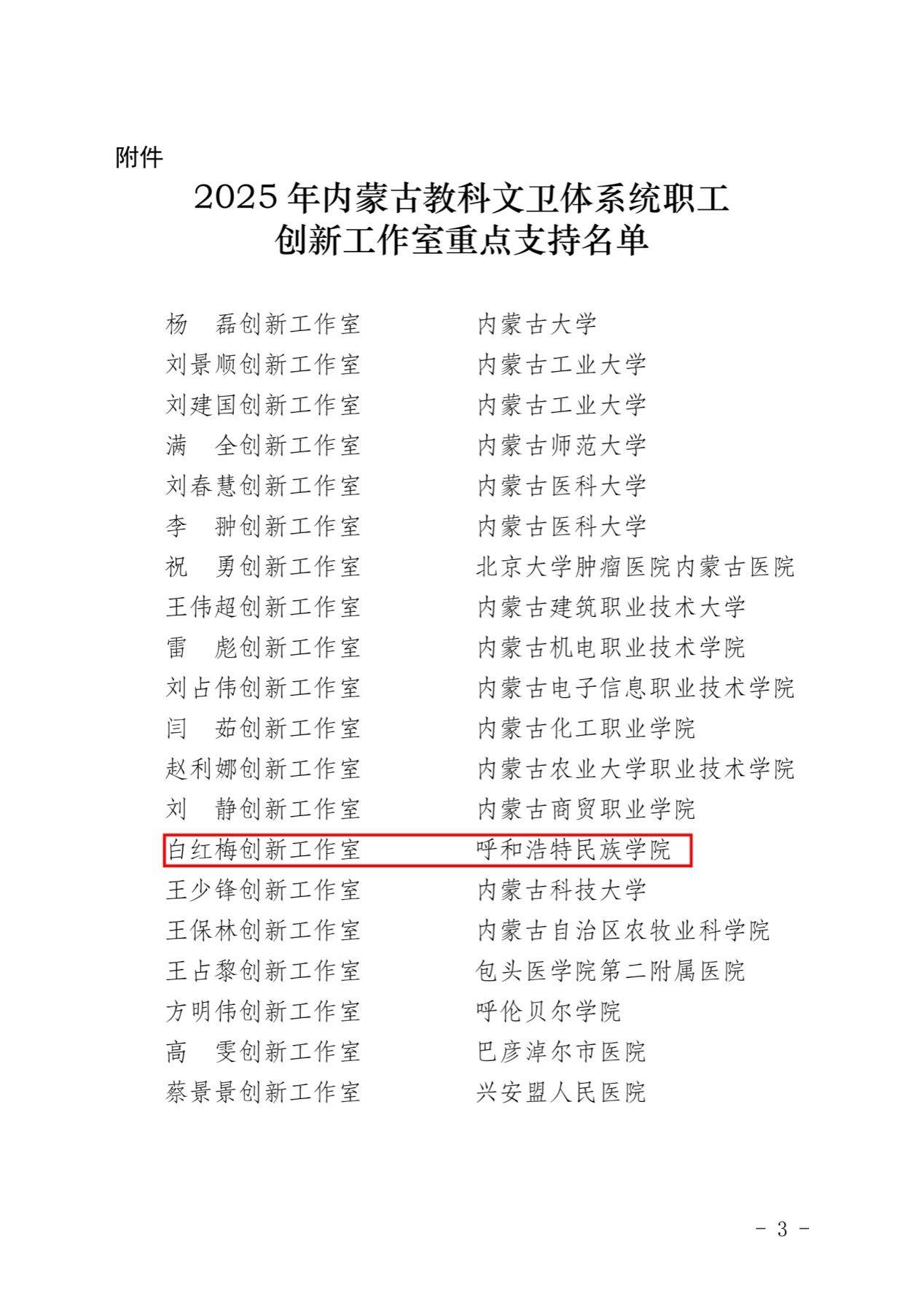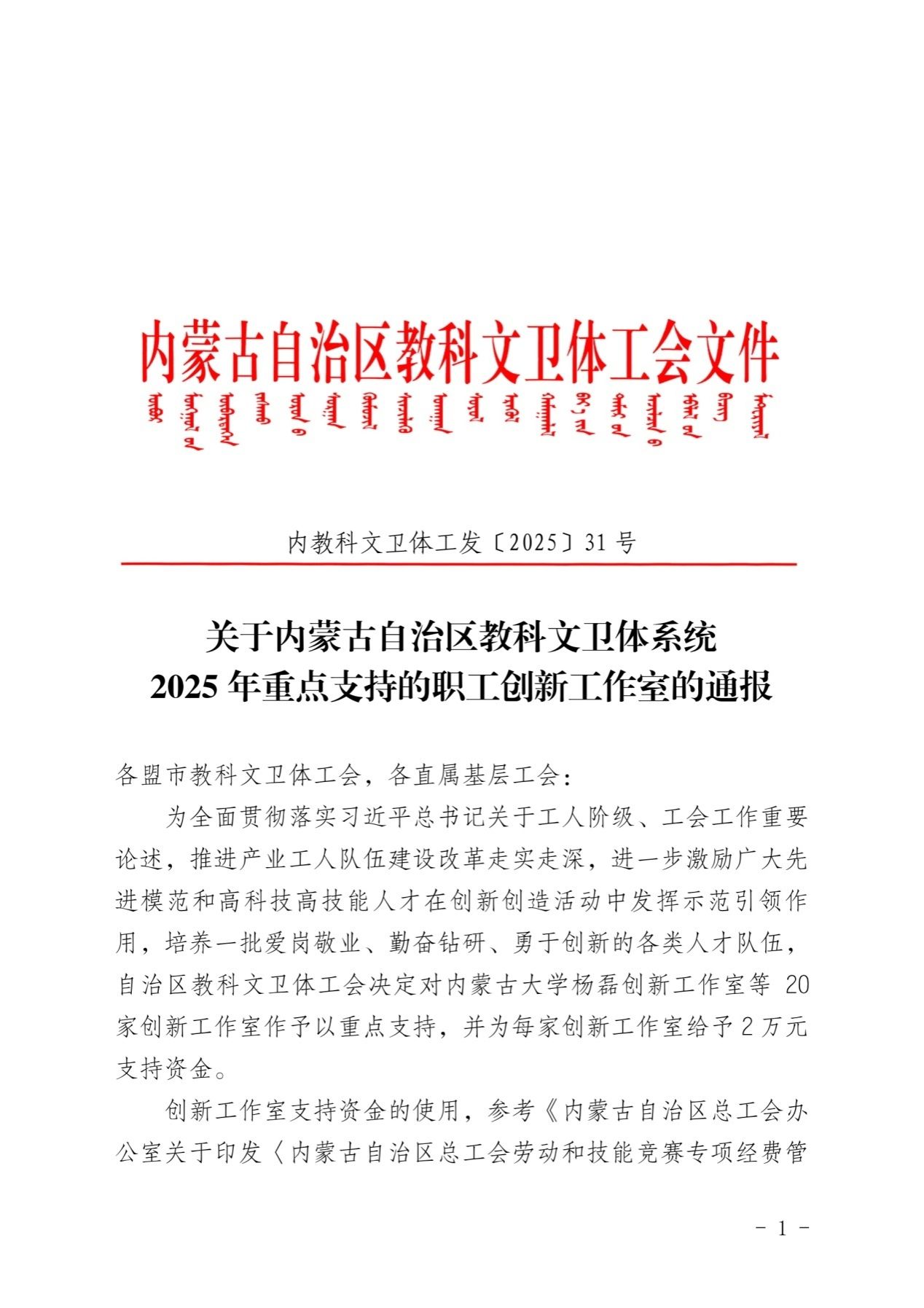 近日,内蒙古自治区教科文卫体系统2025年重点支持职工创新工作室名单公布,鸭脖白红梅创新工作室成功入选。