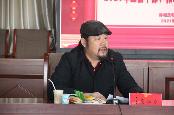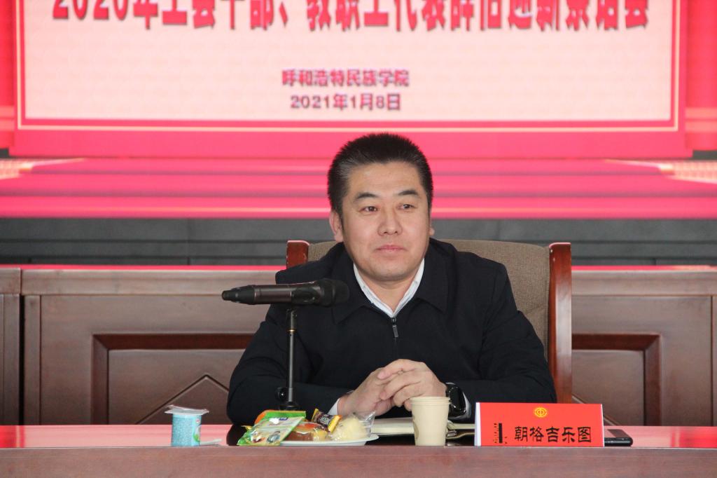 校党委委员、党政办主任朝格吉乐图致辞,他首先向在座的各位并通过他们向全体教职员工致以新年的祝福,对一年来为工会工作,辛勤付出的教职工表示诚挚的慰问和衷心的感谢!同时对2020年的工作进行了简要的回顾并对2021年的工作进行了展望。