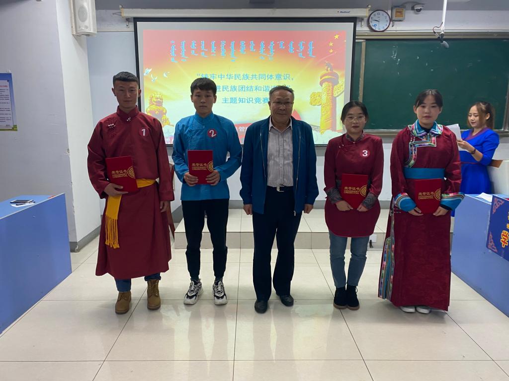 本次竞赛活动分个人必答题、小组必答题、抢答题、风险题四个环节,内容主要包括党建知识、民族问题、宗教信仰、风俗习惯等相关知识。比赛过程异常激烈,每位返乡学生都是“有备而来”,对民族团结应知应会对答如流,你争我夺,不甘示弱,赛出了水平、赛出了风格,赢得了现场观众的阵阵掌声。最后经过激烈角逐,学生党支部一组、学生干部一组、学生党支部二组分别获得团体一、二、三等奖,19档案学包文祥、18文化苏日格格、17文化刘建庆、18档案学郭彩霞分别获得优秀个人奖。公共管理学院院长吴宝山、党总支副书记额尔顿格日乐等同志为取得优异成绩的代表队、个人颁发荣誉证书及奖品。