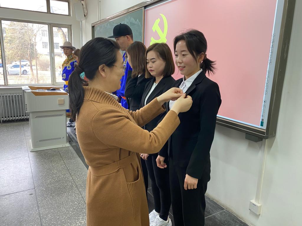 活动中,党总支副书记额尔敦格日勒为学生党员亲自发放并佩戴党徽,介绍了《关于党员佩戴党员徽章》文件,向党支部成员发出“戴党徽亮身份、树形象做表率”的倡议,要求学生党员不断提升服务学生的能力,自觉践行“四个合格”,接受群众监督,用实际行动发挥党员先锋模范带头作用。