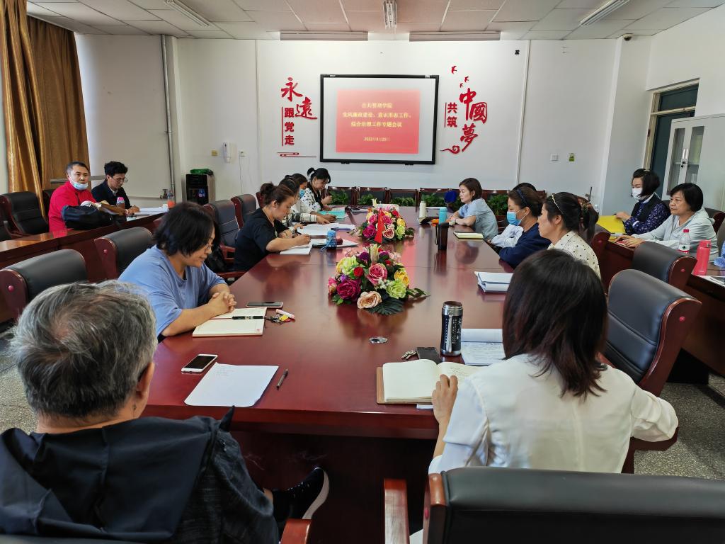 为贯彻落实新时期党风廉政建设工作要求,进一步提高意识形态工作水平,切实担负起综合治理和维护安全稳定工作,2022年8月25日下午,公共管理学院党总支召开2022年度下半年党风廉政建设、意识形态工作、安全稳定工作专题会议。会议由党总支书记海霞主持,全院教职员工参加。