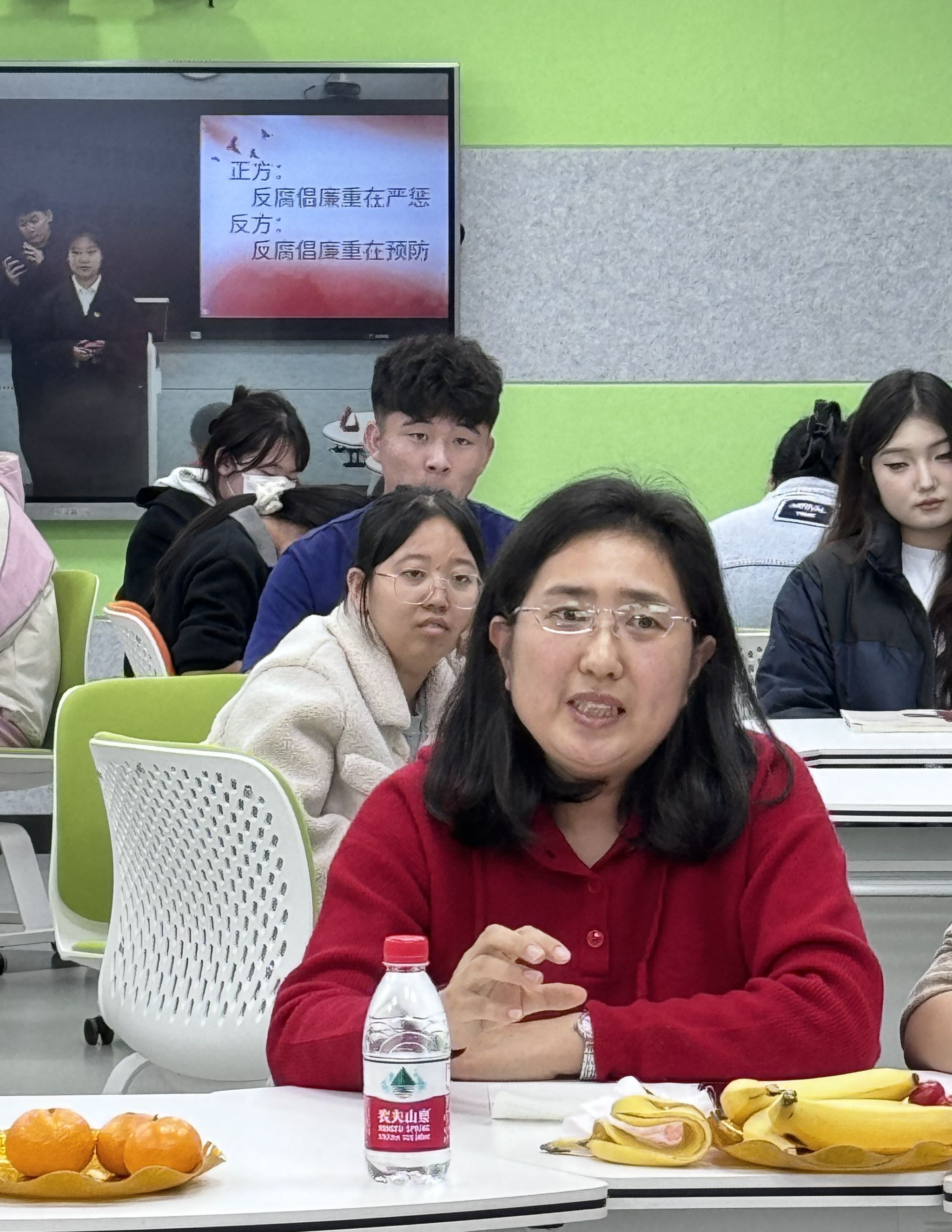 赛场上,由学生党支部积极分子、党员组成的双方辩手你来我往,论据扎实,逻辑严密,妙语连珠。正方以贪腐大案查处后的社会反响为例,强调严惩的警示作用;反方则以完善监督体系避免腐败滋生的事例进行回击。台下观众沉浸其中,掌声不断。