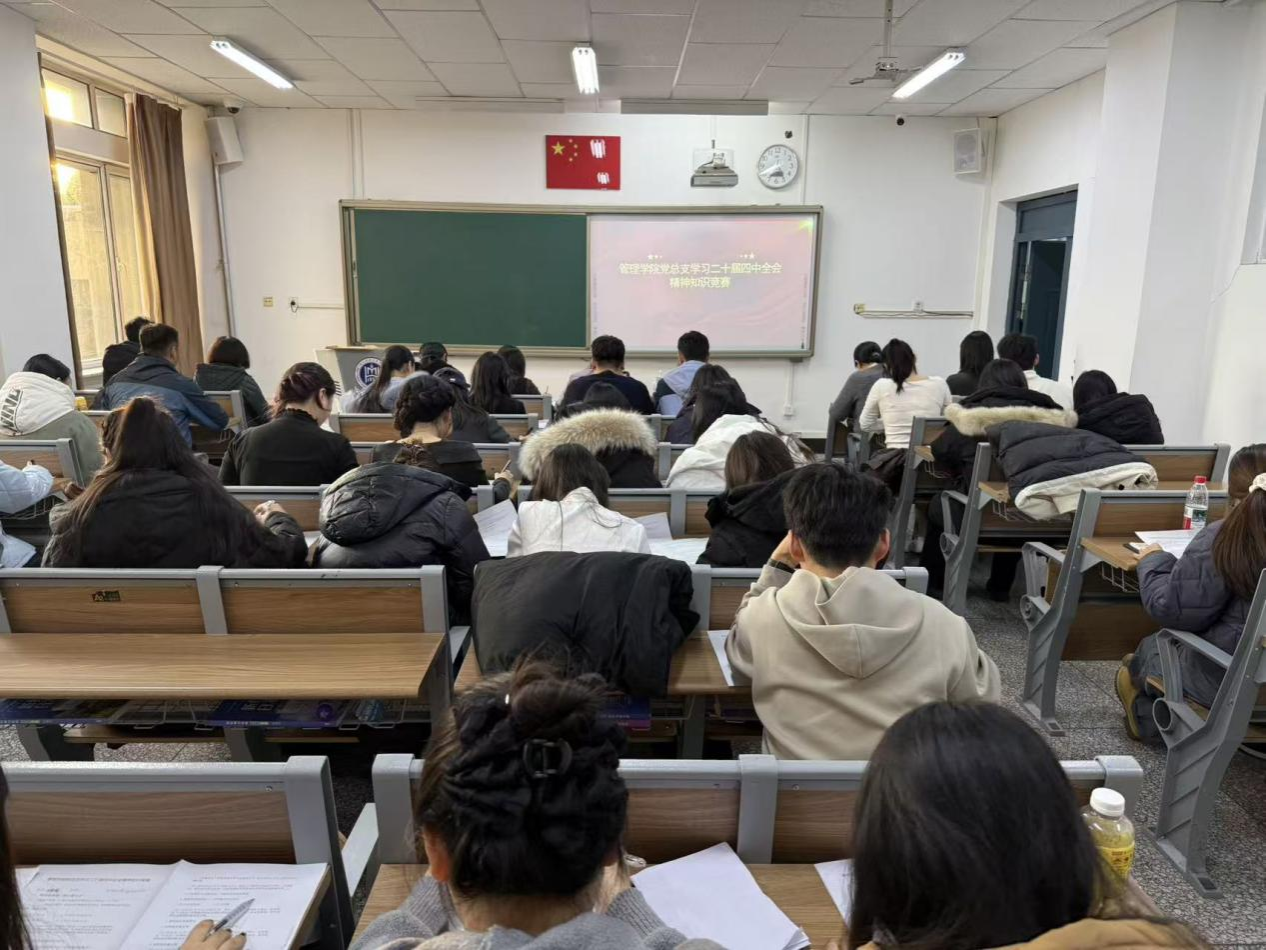 为深入学习贯彻党的二十届四中全会精神,推动理论学习走深走实,12月9日,管理学院党总支组织教职工党支部与学生党支部联合开展二十届四中全会应知应会知识竞赛,全院党员、入党积极分子共50余人以赛竞技、以学促干。