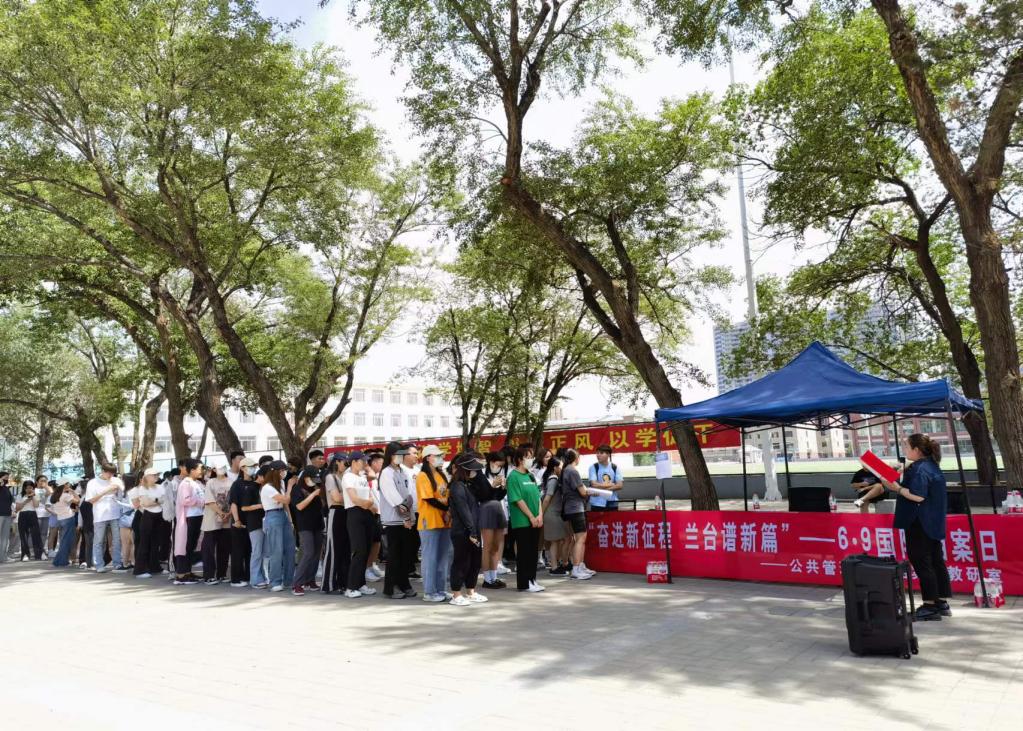 9日下午2:30档案学教研室在学校天骄广场举办了国际档案日知识竞答活动。档案学教研室的全体师生及各学院的300多名师生参与了本次活动。同学们通过现场扫码参与答题活动。工作人员为大家现场发放档案宣传册,普及了档案知识,宣传了档案和档案工作。