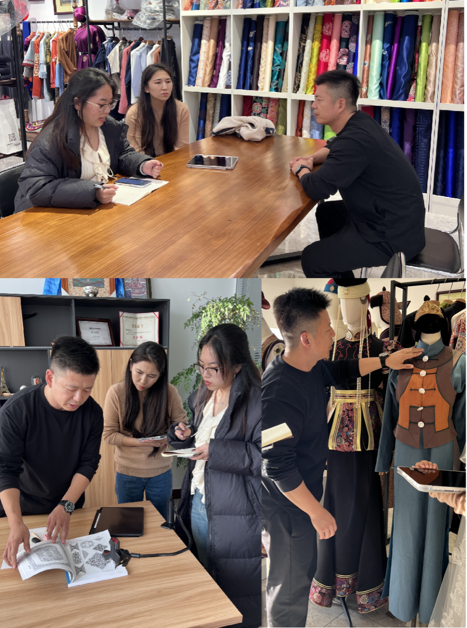 调研首站,学生们走进了鄂尔多斯市博物馆,通过丰富的藏品和生动的展览,深入了解了鄂尔多斯的历史文化,为后续的调研奠定了坚实基础。随后,团队深入乌审旗,实地探访多家民族服饰店。访谈中,学生们了解到传统蒙古袍的制作工艺、市场定位及面临的挑战,发现服饰店为迎合年轻市场,在保持传统的同时不断创新面料与设计。此番经历让学生们深刻体会到民族服饰文化在传承与创新中的平衡,认识到传统服饰既是民族文化的载体,也需与时俱进,融入现代元素,以焕发新的生命力。