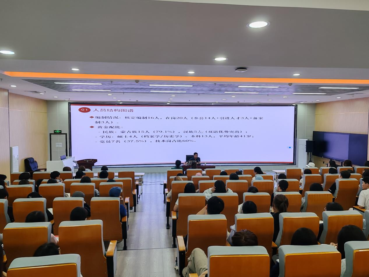 为迎接第18个国际档案日,深化档案学专业建设,2025年5月29日,档案学教研室与多模态图档数智化创新工作室在铸牢教育馆一楼报告厅联合举办“旗县级档案史志馆职能解析与行业实践”专题讲座。阿拉善左旗档案史志馆苏依勒图馆长应邀担任主讲,为师生带来一场精彩纷呈的职业认知课。管理学院档案学专业150余名师生参加了本次讲座。
