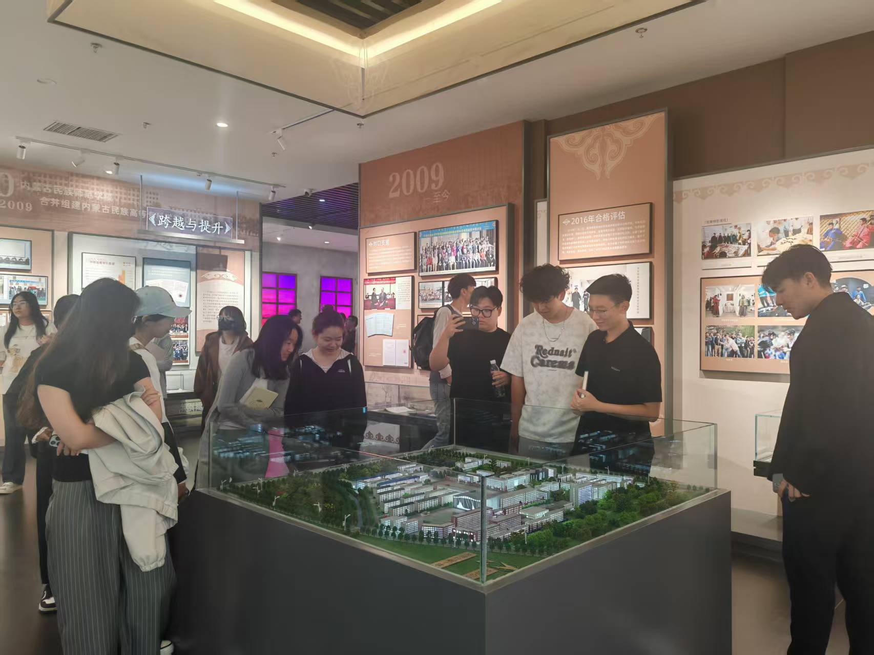 在哈斯同力嘎老师的引导下,同学们步入展厅。教育馆以铸牢中华民族共同体意识为主线,参照《中华民族共同体概论课》,以中华民族共同体的起源、形成和发展为脉络,由“我们从哪里来?”“我们是谁?”“我们要到哪里去?”三大部分构成。详实文献、珍贵影像与沉浸式场景还原相得益彰,生动呈现了中华民族从自在到自觉、迈向伟大复兴的壮阔征程。