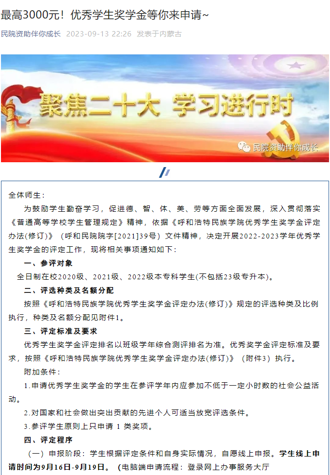 转载学校党委学生工作部(处)《优秀学生奖学金通知》