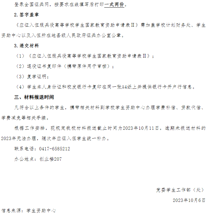 转载学校党委学生工作部(处)《关于做好2023年应征入伍学生学费补偿、贷款代偿及学费减免的通知》