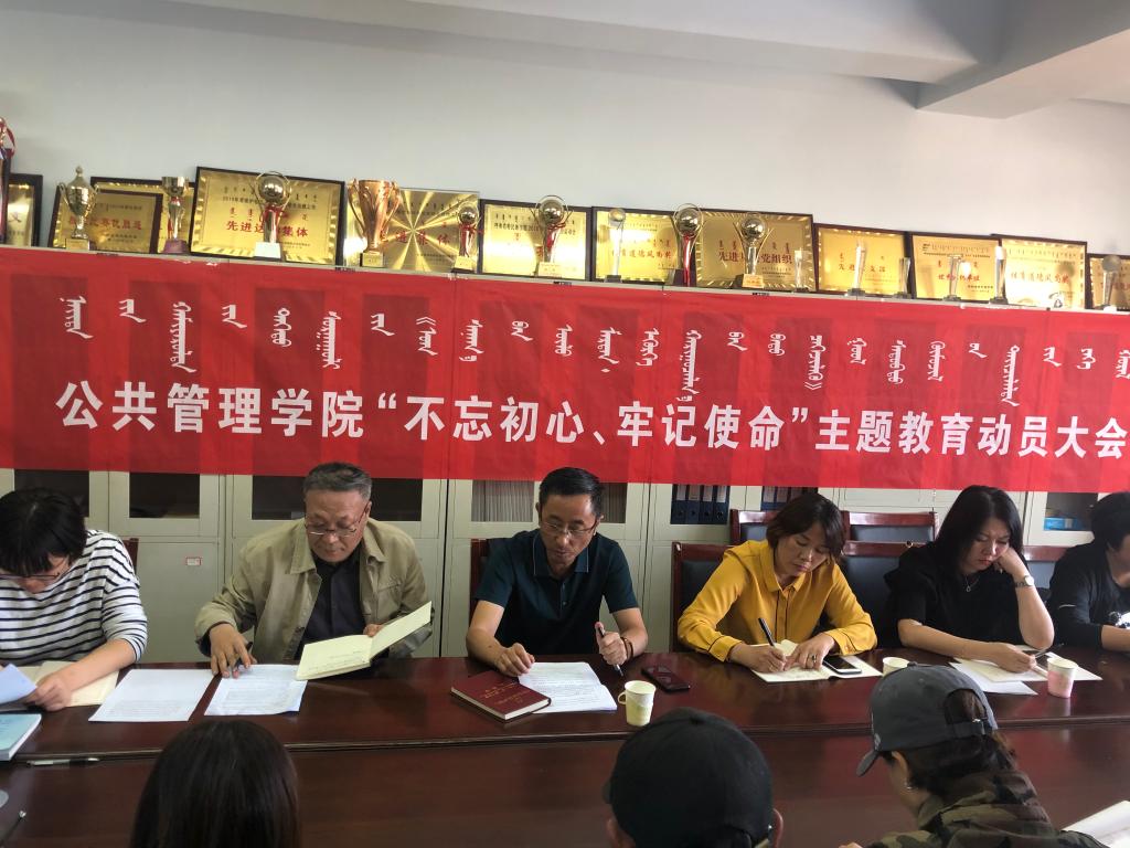 首先由党总支副书记额尔敦格日乐老师传达了公共管理学院开展“不忘初心、牢记使命”主题教育活动相关方案,同时对主题教育的开展进行部署动员讲话。